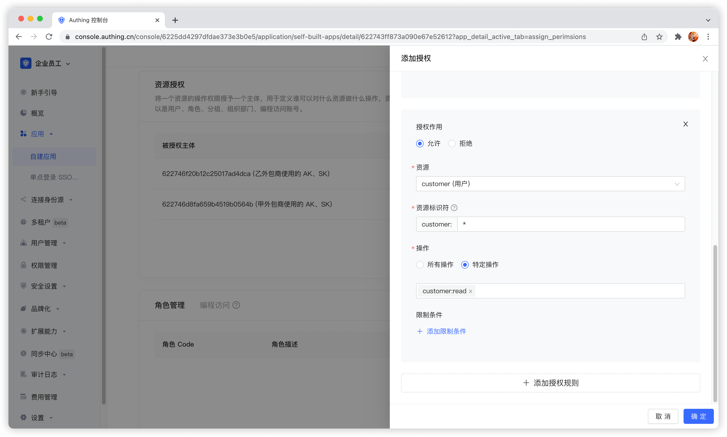 授权规则中,资源类型选择公告信息,资源标识符填写 * 代表授权所有公告资源,操作选择特定操作,然后选择 announce:read 操作。最后点击确定。这条规则的作用是:将所有公告信息资源的读取权限授权给甲外包公司。
