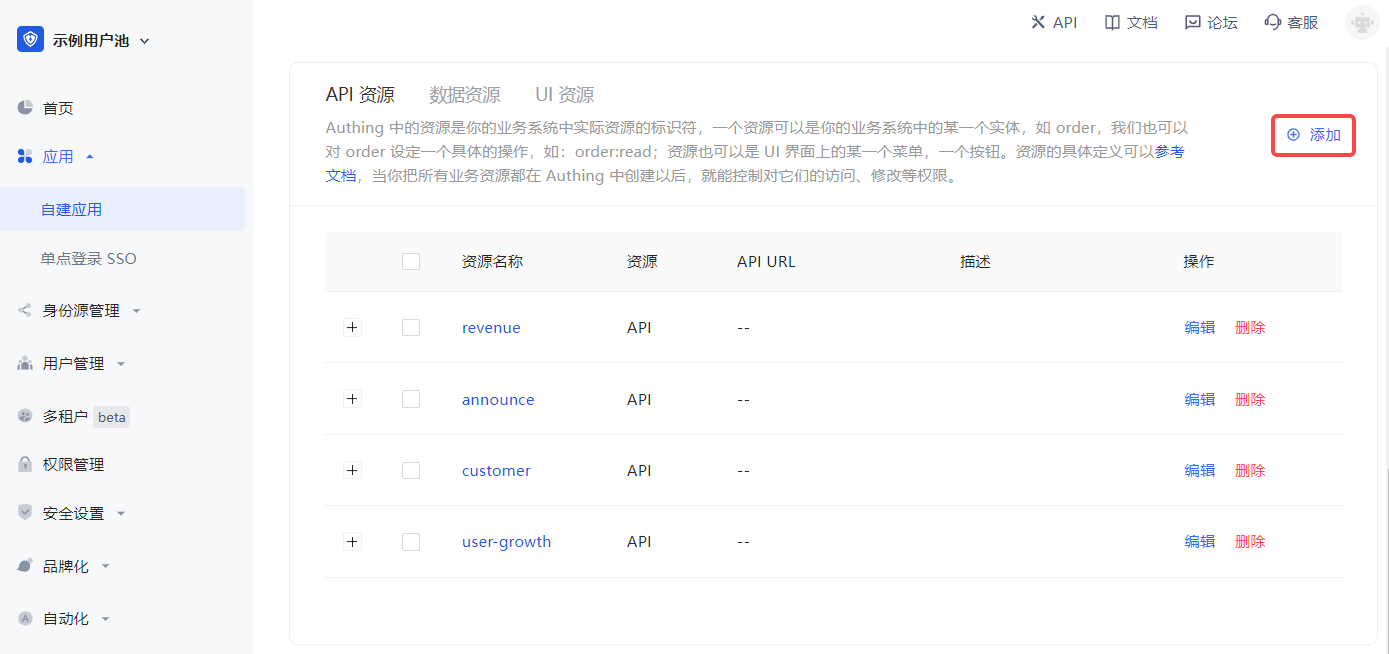 在「大屏展示」应用下(访问授权->API资源)定义一些资源,每个资源对应「大屏展示」应用中实际的资源。这里我们添加一些资源,包括用户增长(user-growth)、客户(customer)、公告(announce)、营收(revenue)。这些资源的名称就是 API scope。