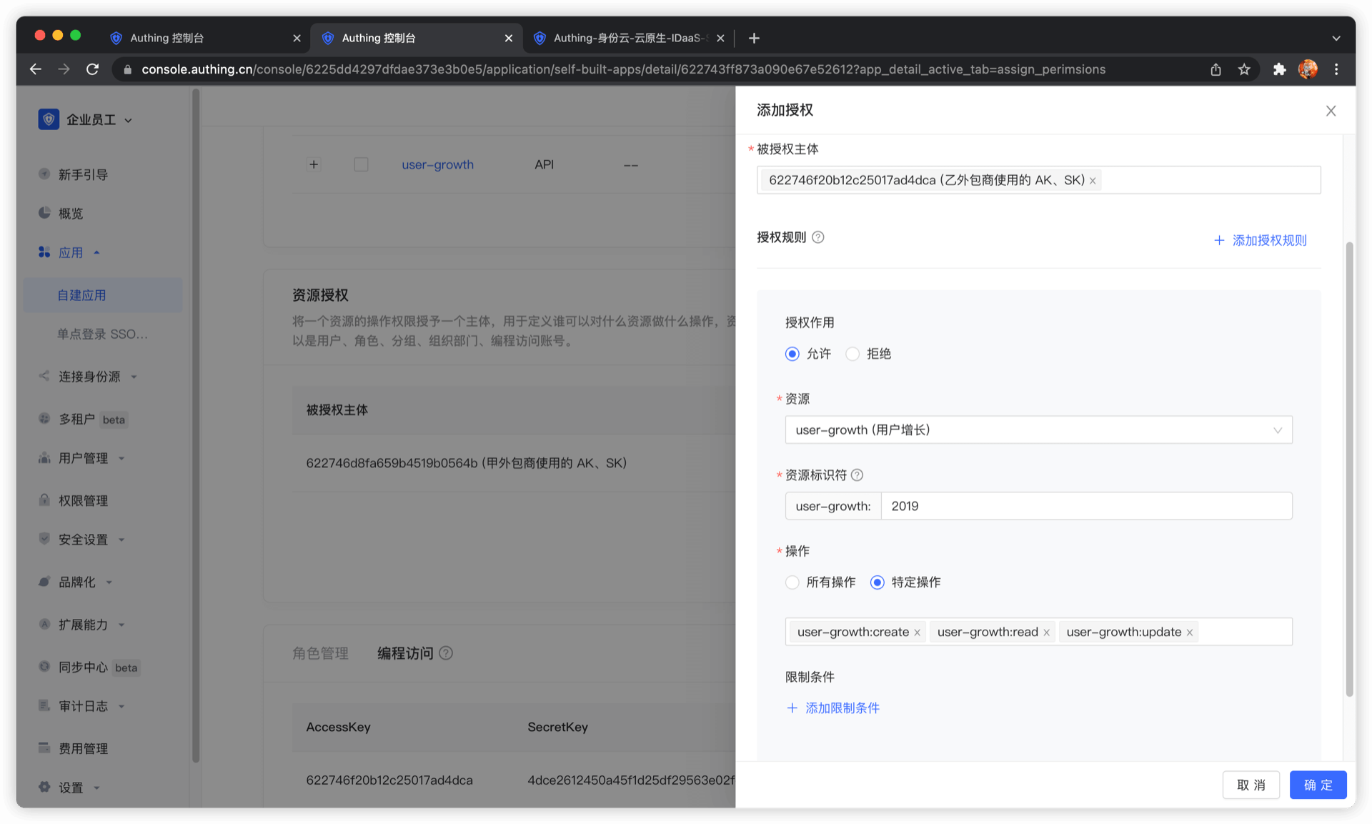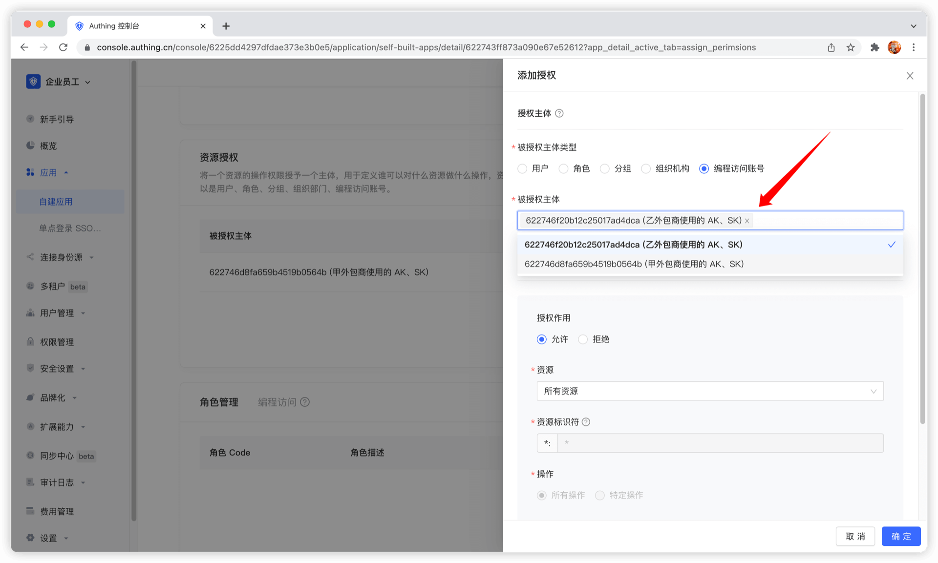 被授权主体类型选择编程访问账号,然后选择甲外包公司的编程访问账号账号。