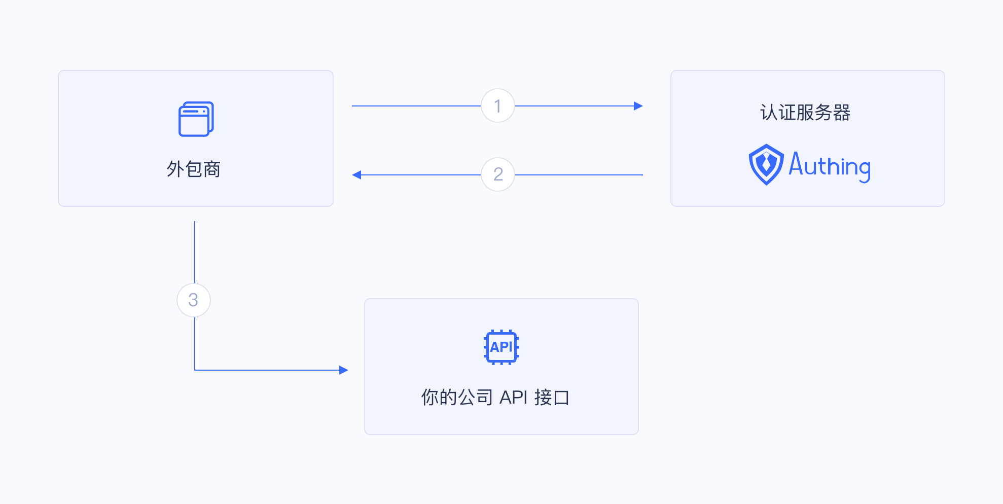 以下是该场景的架构图,外包商先到 Authing 获取 Access Token,然后携带 Access Token 访问公司服务的 API 接口:
