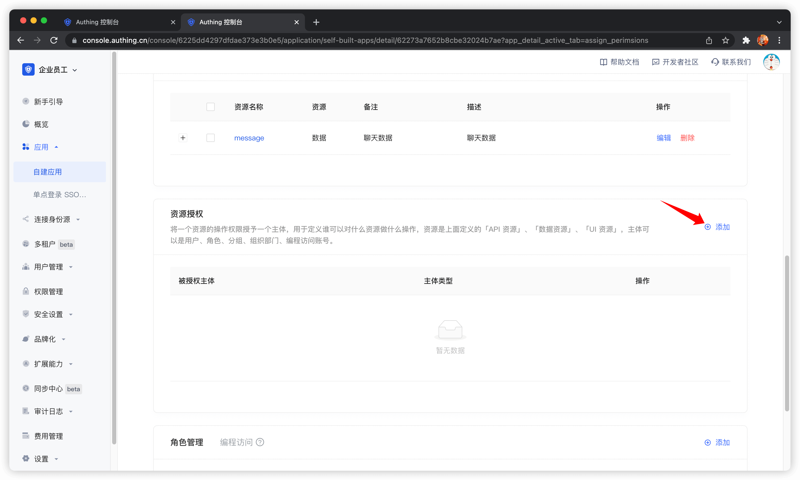 下面我们需要赋予他们资源权限。在资源授权选项卡,点击添加。