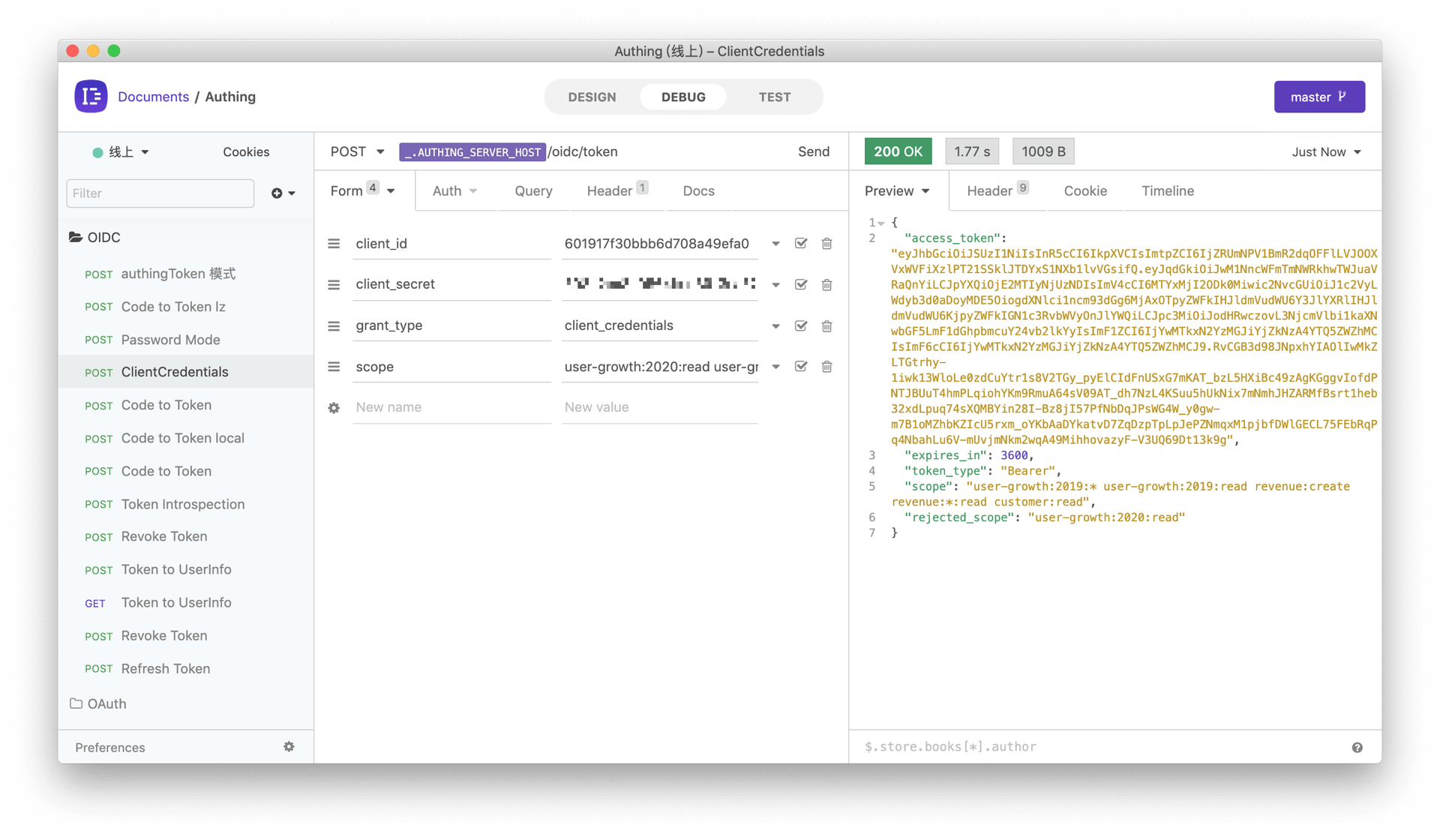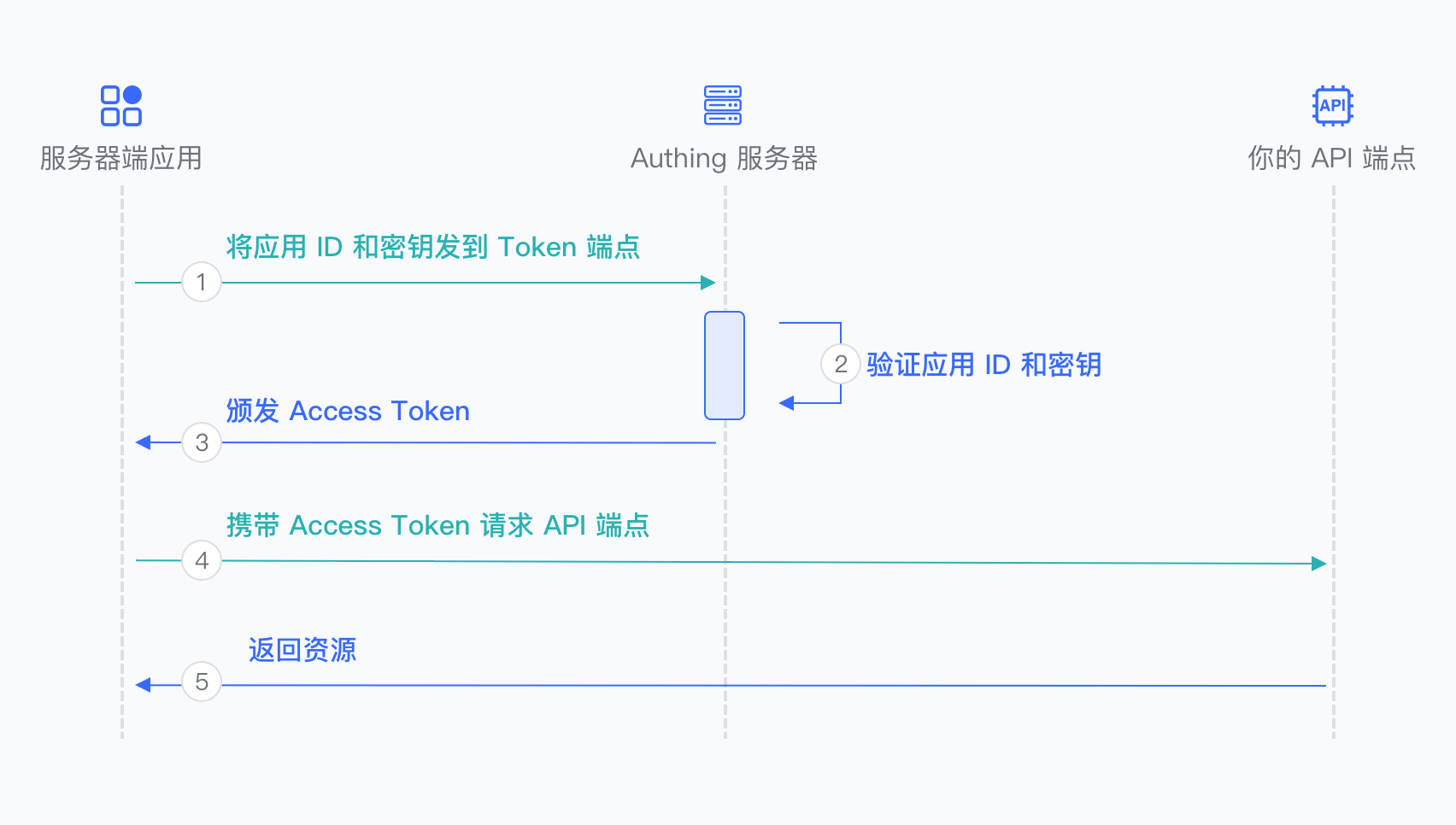 通过 OIDC ClientCredentials 授权模式,调用方需要向 Authing 提供他的 ClientCredentials(也就是编程访问账号的 Key 和 Secret)和需要请求的权限 scope(也就是资源标识符)来直接获得一个具有该 API 权限的 AccessToken。
