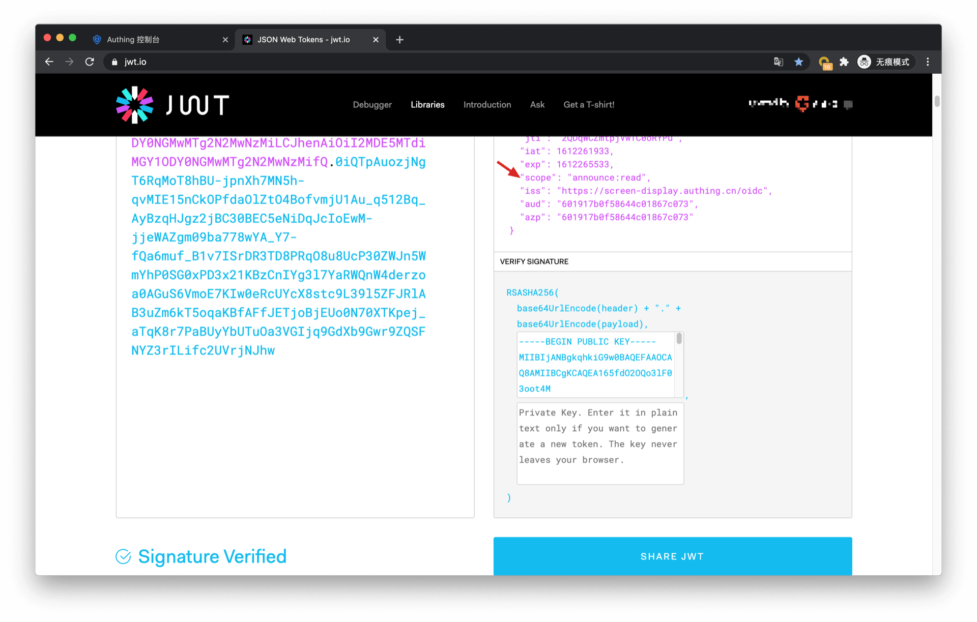 RS256 是一种非对称签名算法,Authing 持有私钥对 Token 进行签名,JWT 的消费者使用公钥来验证签名。RS256 签名算法,有以下好处: