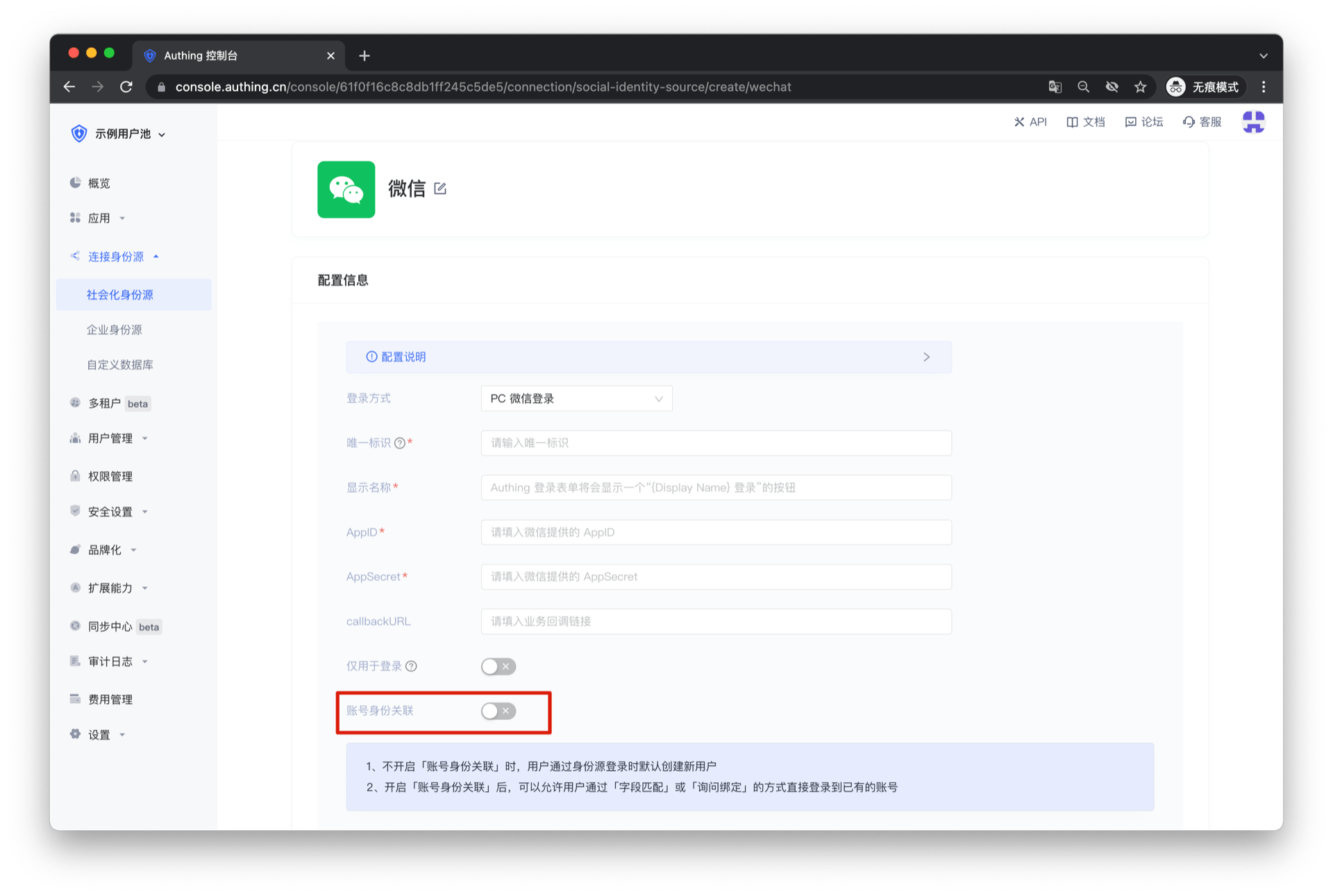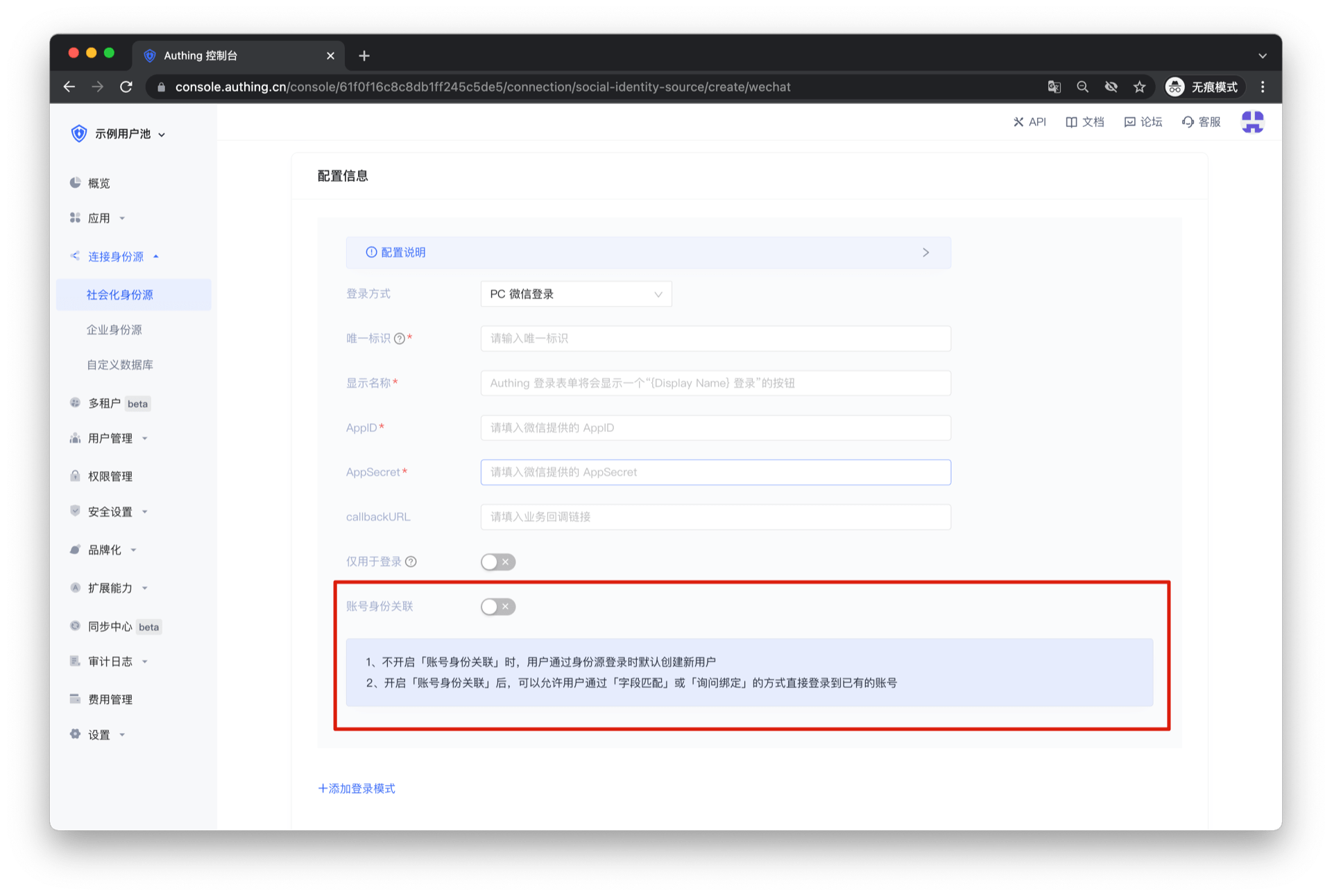 使用「身份源连接的账号关联」功能,让你的用户在使用你所配置的社会化身份源和企业身份源登录时,能够直接登录到已有账号。你可以在创建身份源连接时看到相关的配置项。
