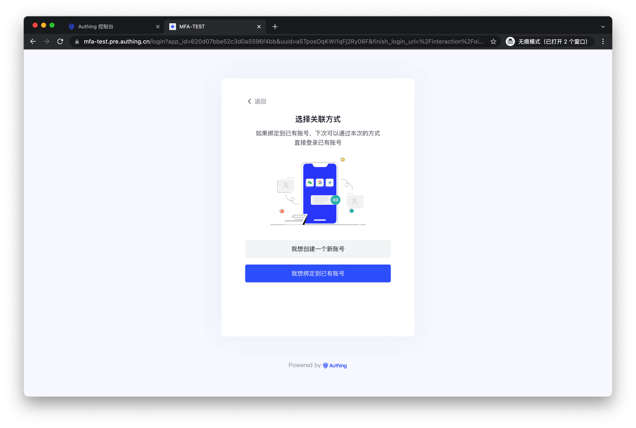 在 Authing 控制台完成询问绑定的相关配置后,你的用户在使用身份源登录时会被提示选择是「创建新账号」还是「绑定到已有账号」。