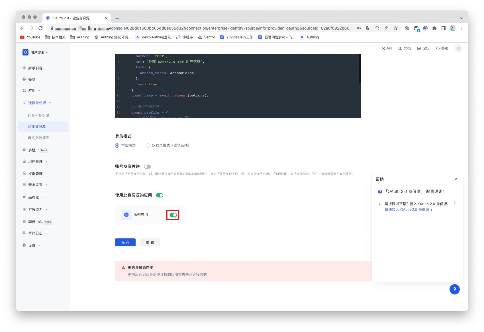 3.2 在已创建好的 OAuth2.0 身份源连接详情页面,开启并关联一个在 Authing 控制台创建的应用。