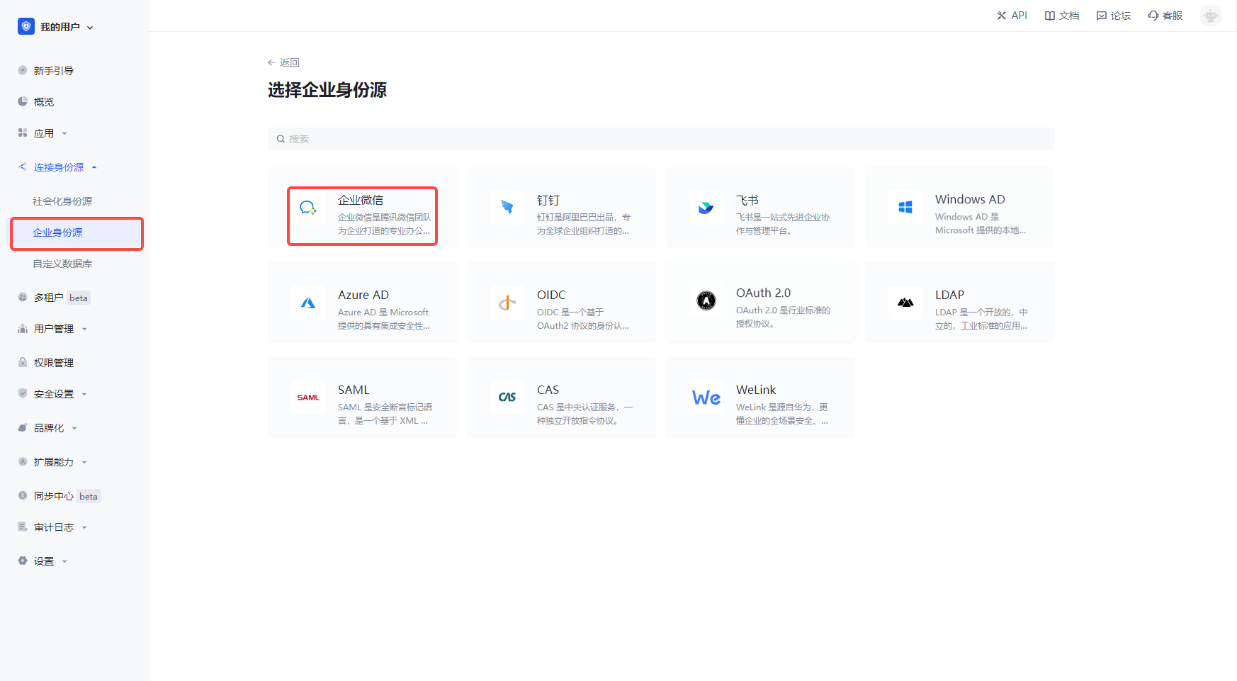 2.1 请在 Authing Console 控制台 的「企业身份源」页面,点击「创建企业身份源」按钮,进入「选择企业身份源」页面,点击「企业微信」身份源按钮
