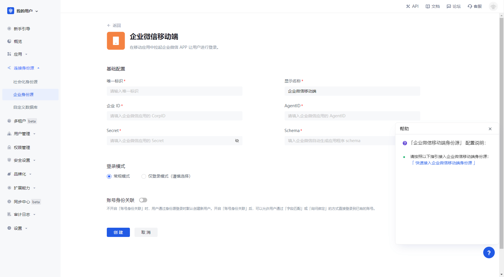 | 唯一标识 | a. 唯一标识由小写字母、数字、- 组成,且长度小于 32 位。 b. 这是此连接的唯一标识,设置之后不能修改。 |