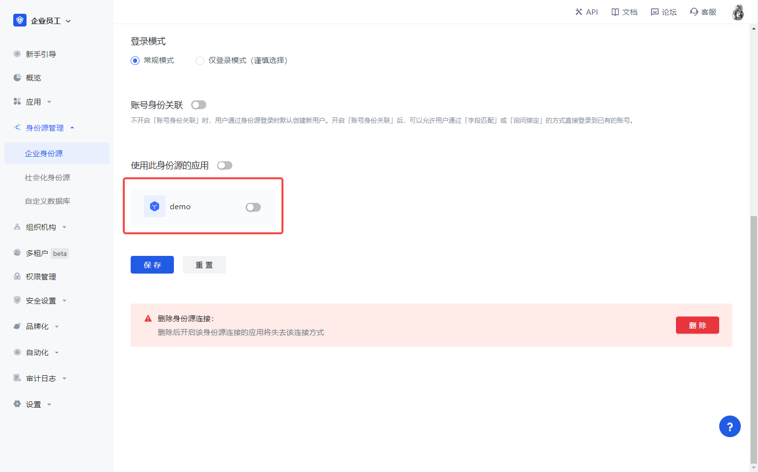 | 账号身份关联 | 不开启「账号身份关联」时,用户通过身份源登录时默认创建新用户。开启「账号身份关联」后,可以允许用户通过「字段匹配」或「询问绑定」的方式直接登录到已有的账号。 |
