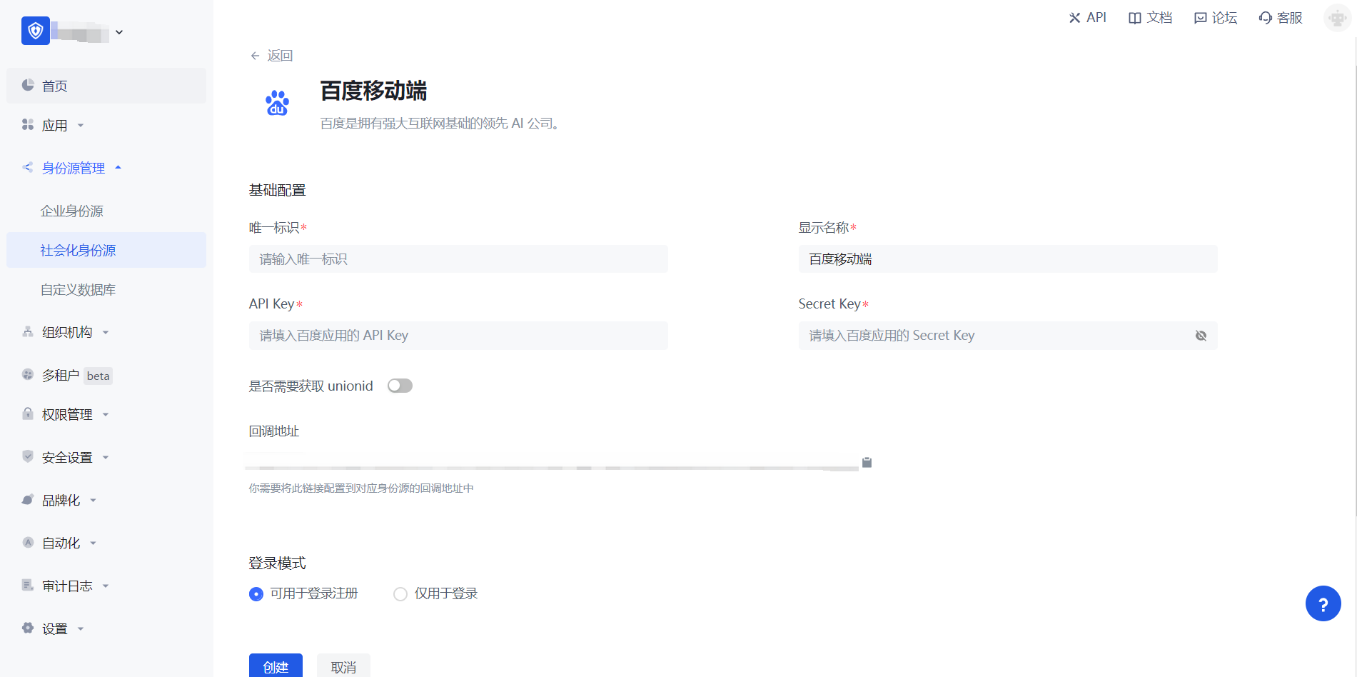 2.3 请在 Authing 控制台 的「社会化身份源」-「百度移动端」页面,配置相关的字段信息。