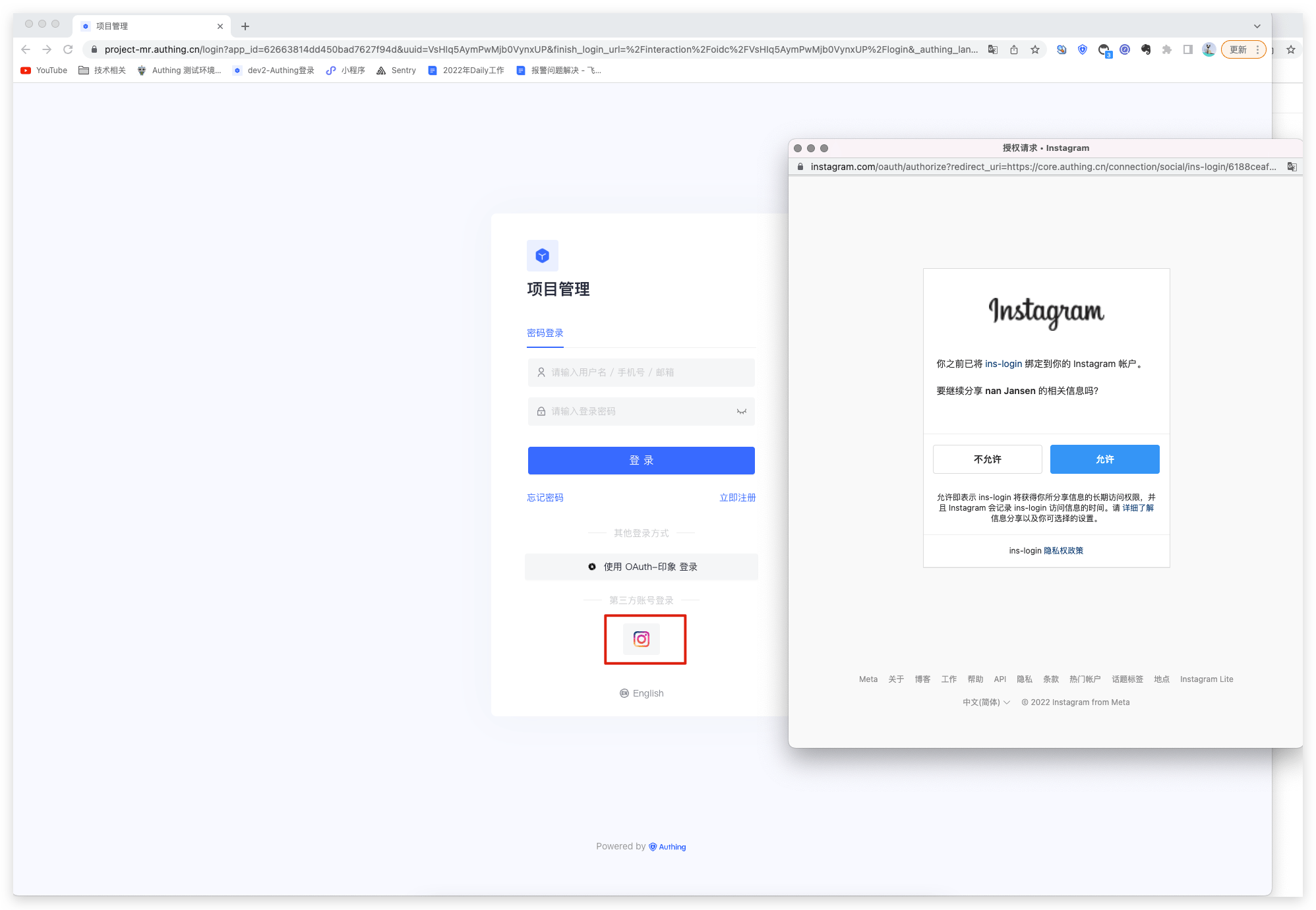- 概述:Instagram 社会化登录是用户以 Instagram 为身份源安全登录第三方应用或者网站。在 Authing 中配置并开启 Instagram 的社会化登录,即可实现通过 Authing 快速获取 Instagram 基本开放的信息和帮助用户实现免密登录功能。