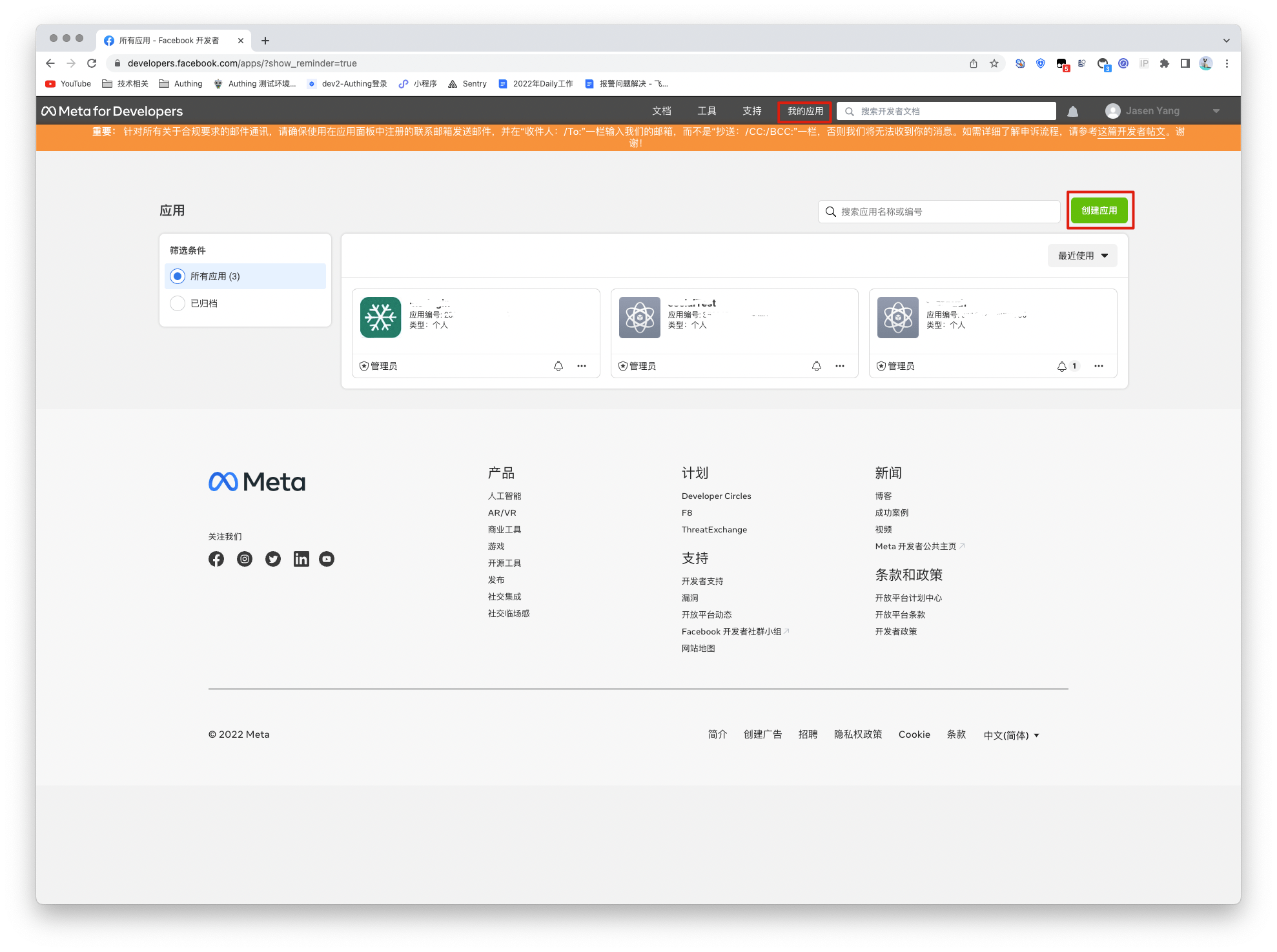 前往 developers.facebook.com (opens new window),点击我的应用,然后创建新应用并选择消费者或无应用类型,填写应用名称。