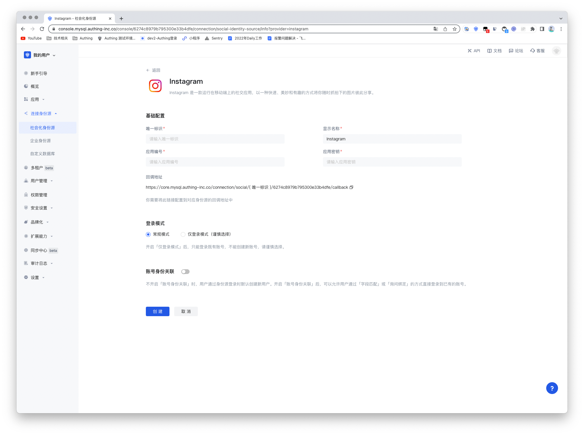 2.3 请在 Authing Console 控制台 的「社会化身份源」-「Instagram」页面,配置相关的字段信息。