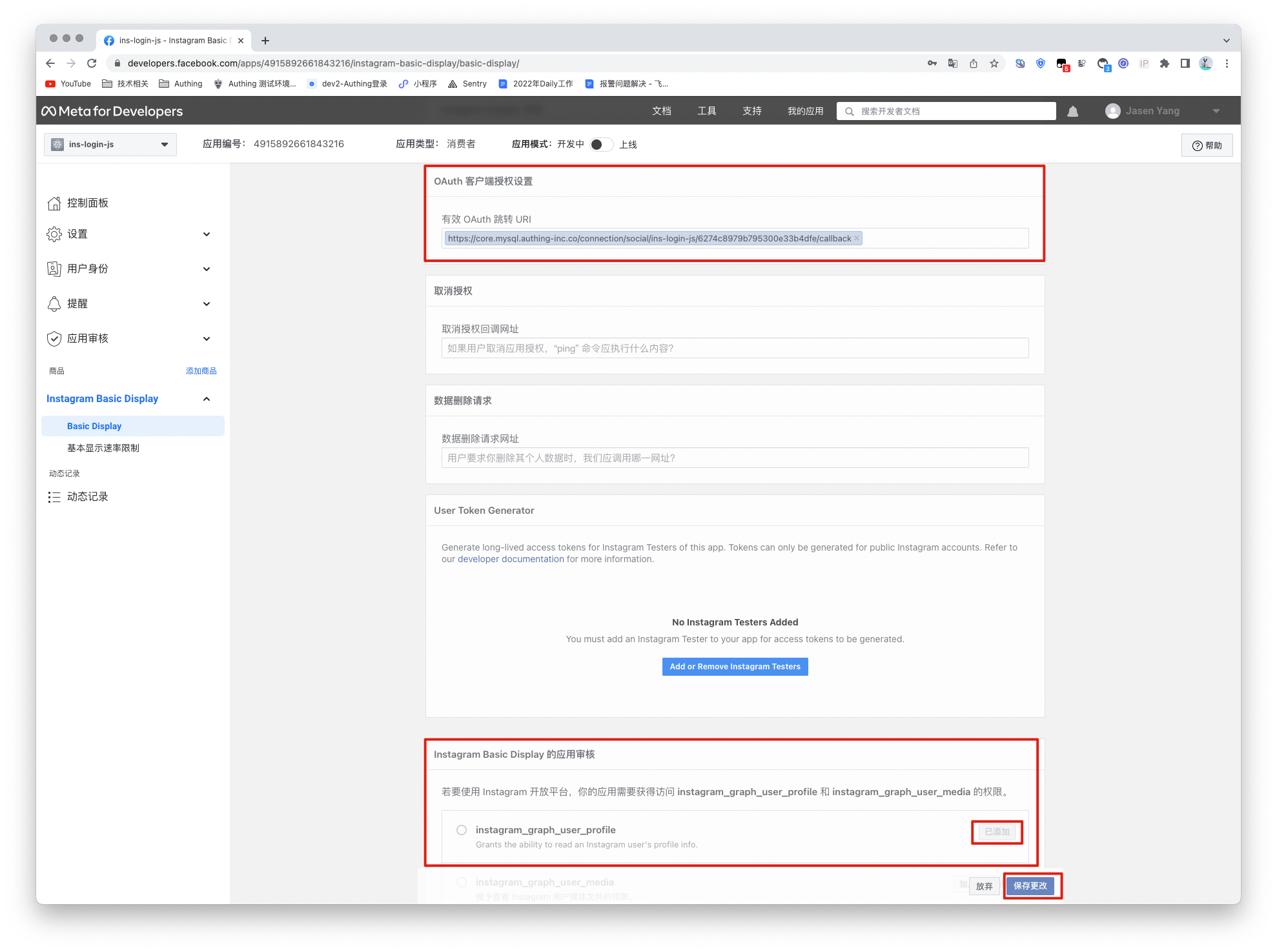 在 Authing 控制台上创建完 Instagram 身份源后,需要将回调地址配置到 Instagram 的开放平台上的 Instagram 应用中OAuth 客户端授权设置。