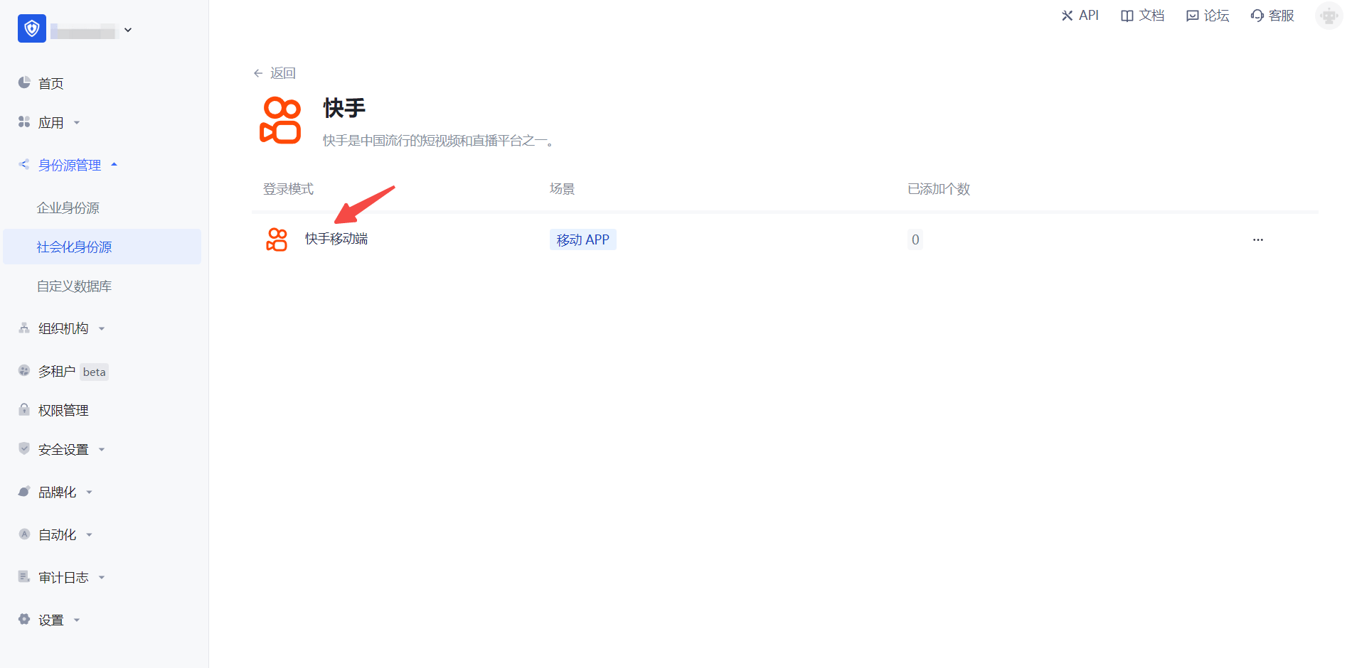 2.2 请在 Authing 控制台 的「社会化身份源」-「选择社会化身份源」页面,点击「快手」身份源按钮,进入「快手移动端登录模式」页面。