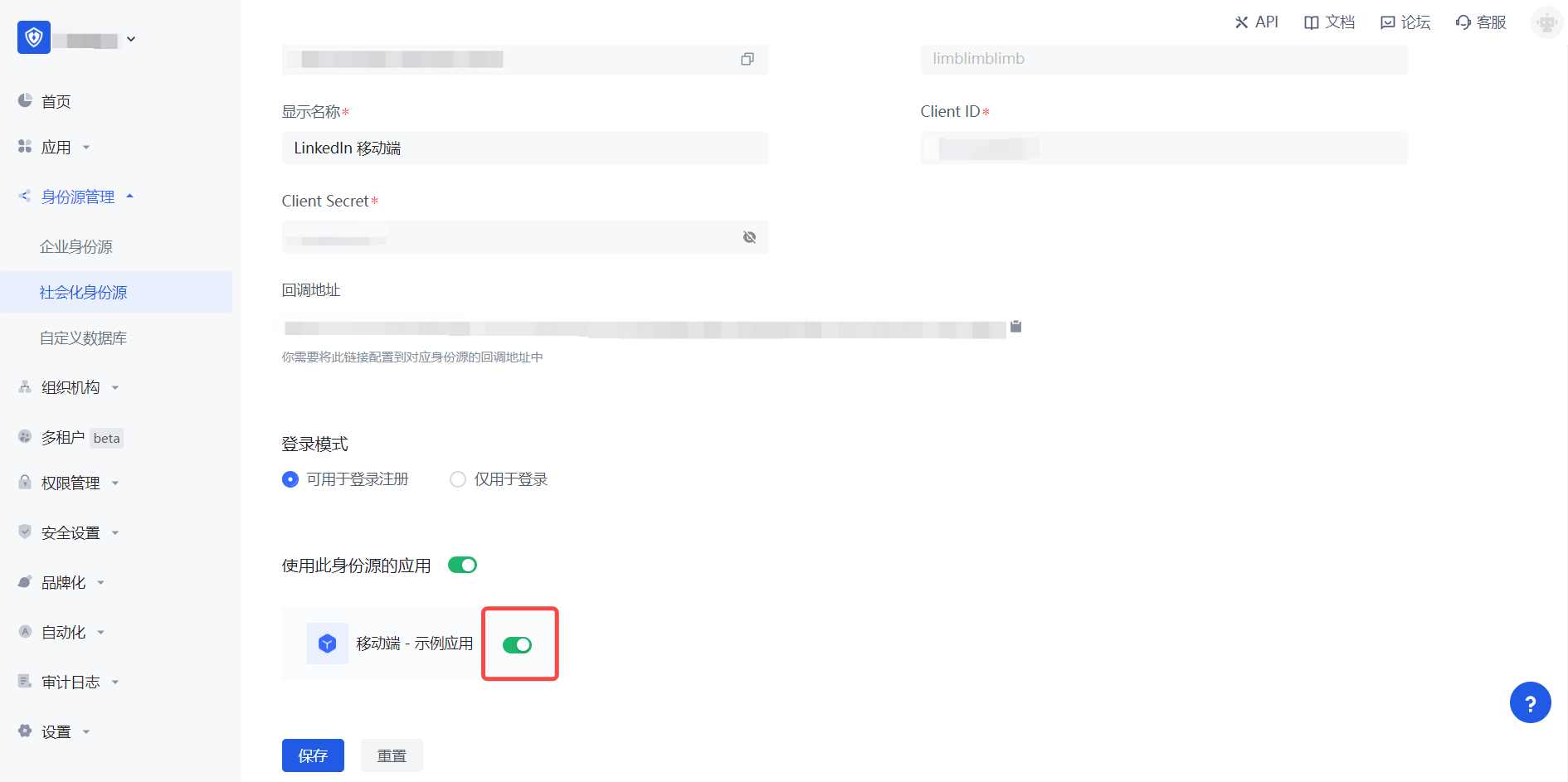 2.3 请在 Authing 控制台 的「社会化身份源」-「LinkedIn」页面,配置相关的字段信息。