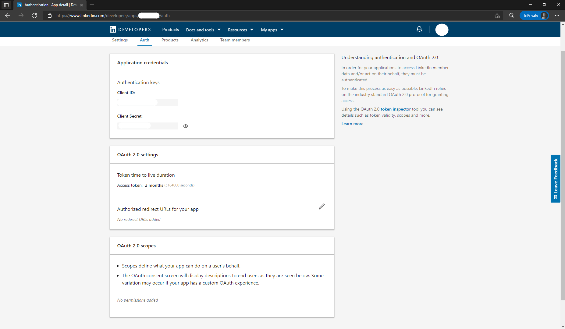 | Client secrets | LinkedIn 应用密钥,需要在 linkedIn developers 上获取。 |