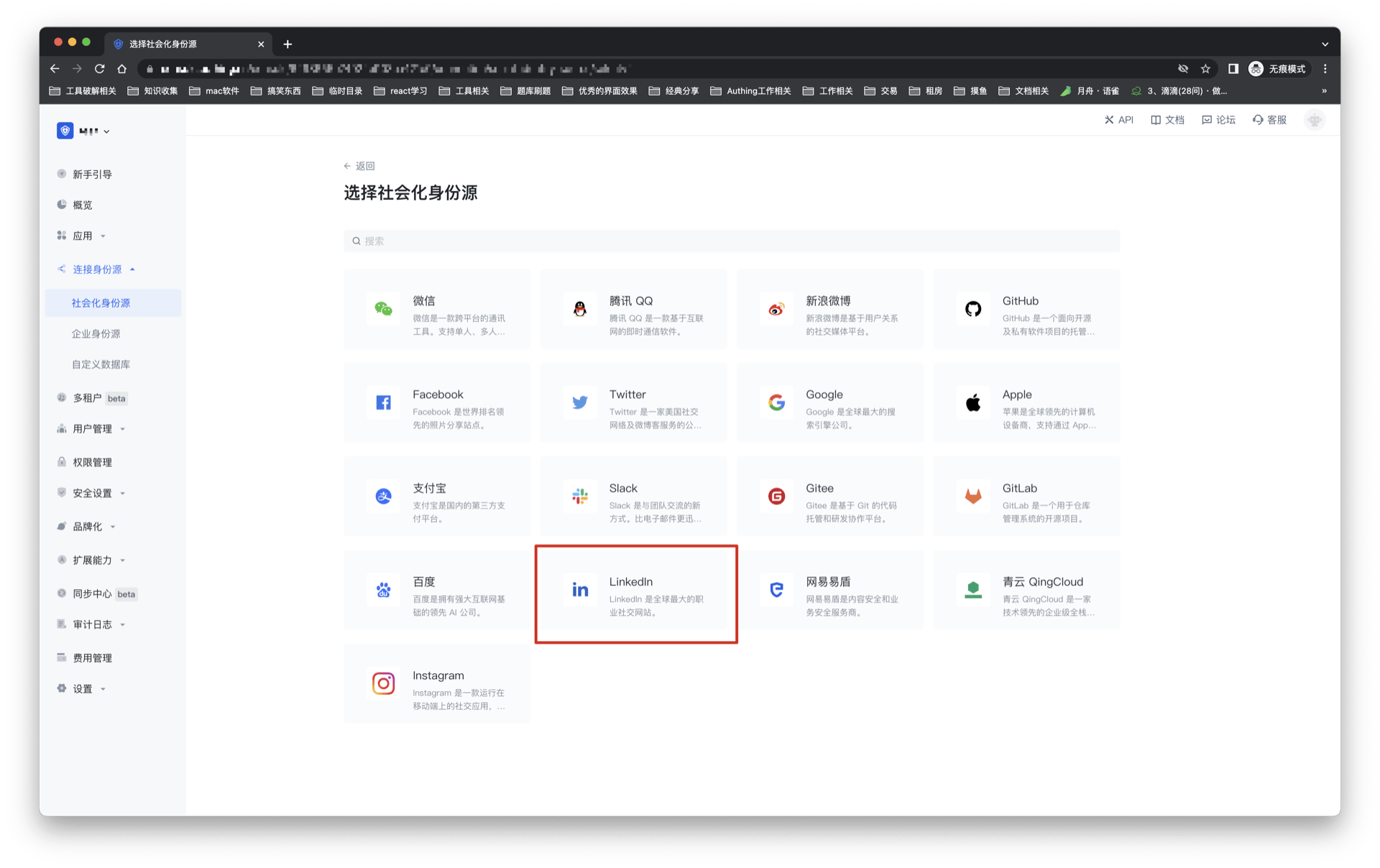2.2 请在 Authing 控制台 的「社会化身份源」-「选择社会化身份源」页面,点击「LinkedIn」身份源按钮,进入 「LinkedIn 登录模式」页面。