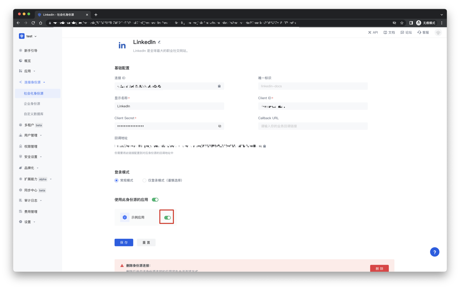3.2 在已创建好的 LinkedIn 身份源连接详情页面,开启并关联一个在 Authing 控制台创建的应用