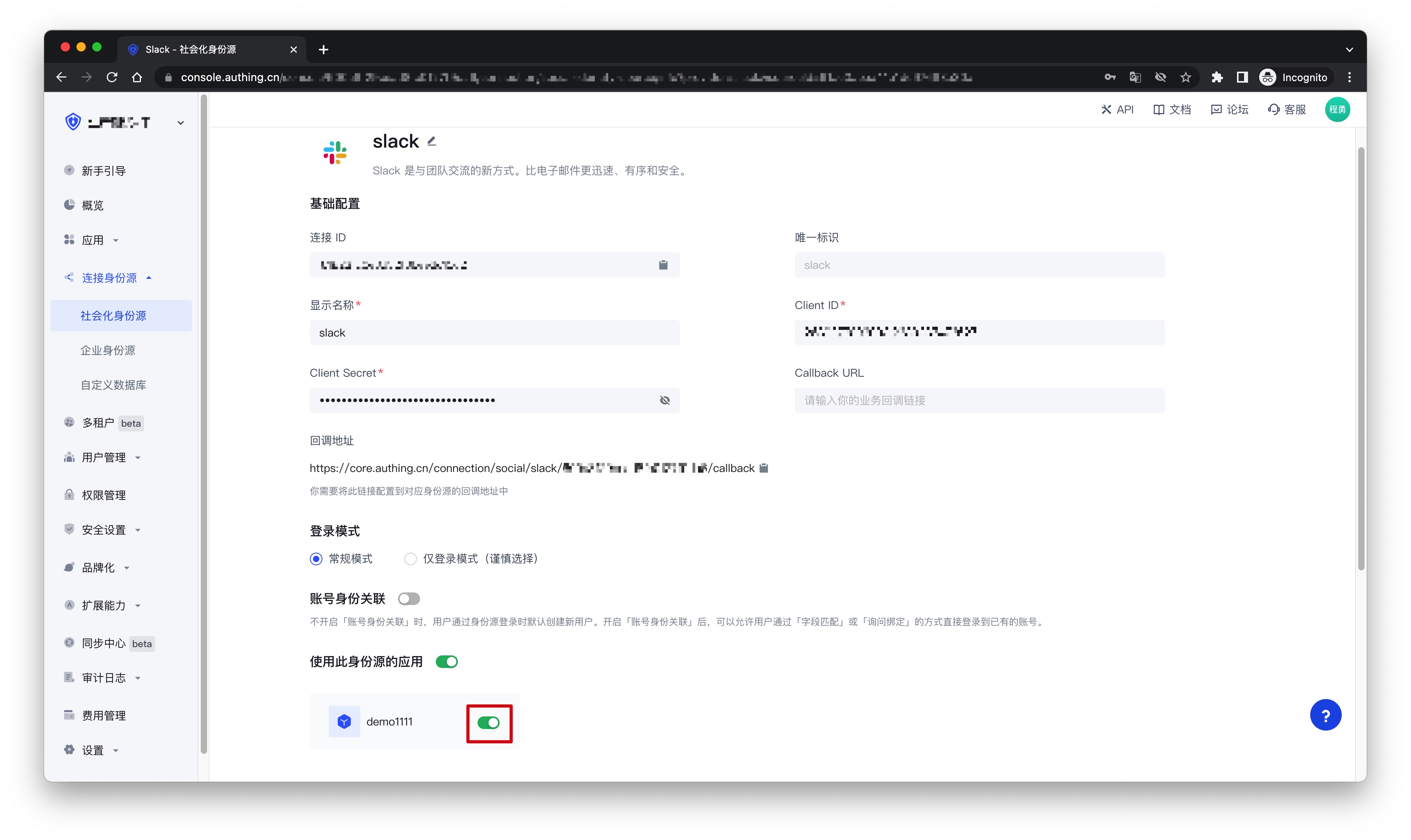 3.2 在已创建好的「Slack」身份源连接详情页面,开启并关联一个在 Authing 控制台创建的应用