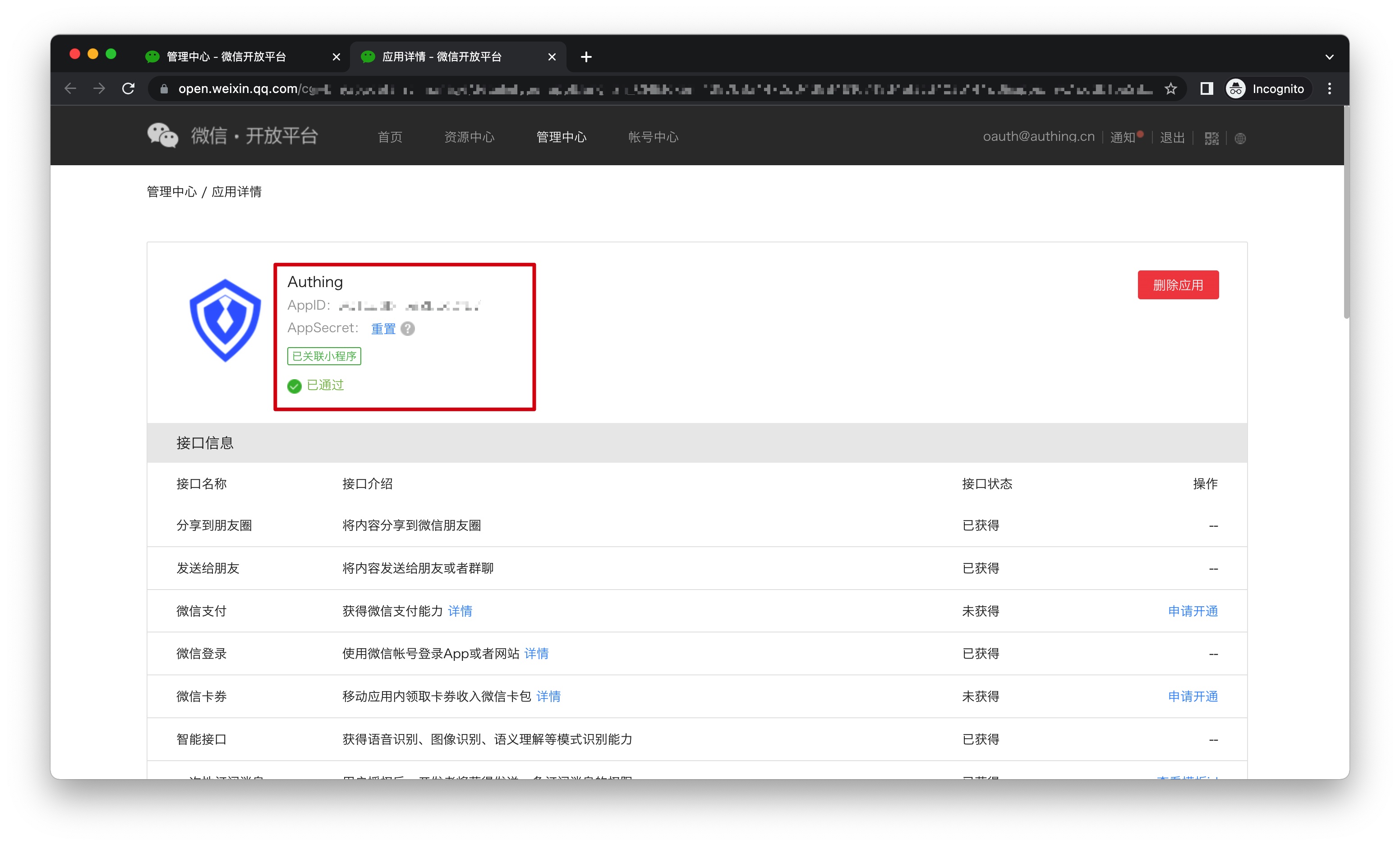 创建完成之后,你需要记录下该应用的 AppID 和 AppSecret,后面需要用到。