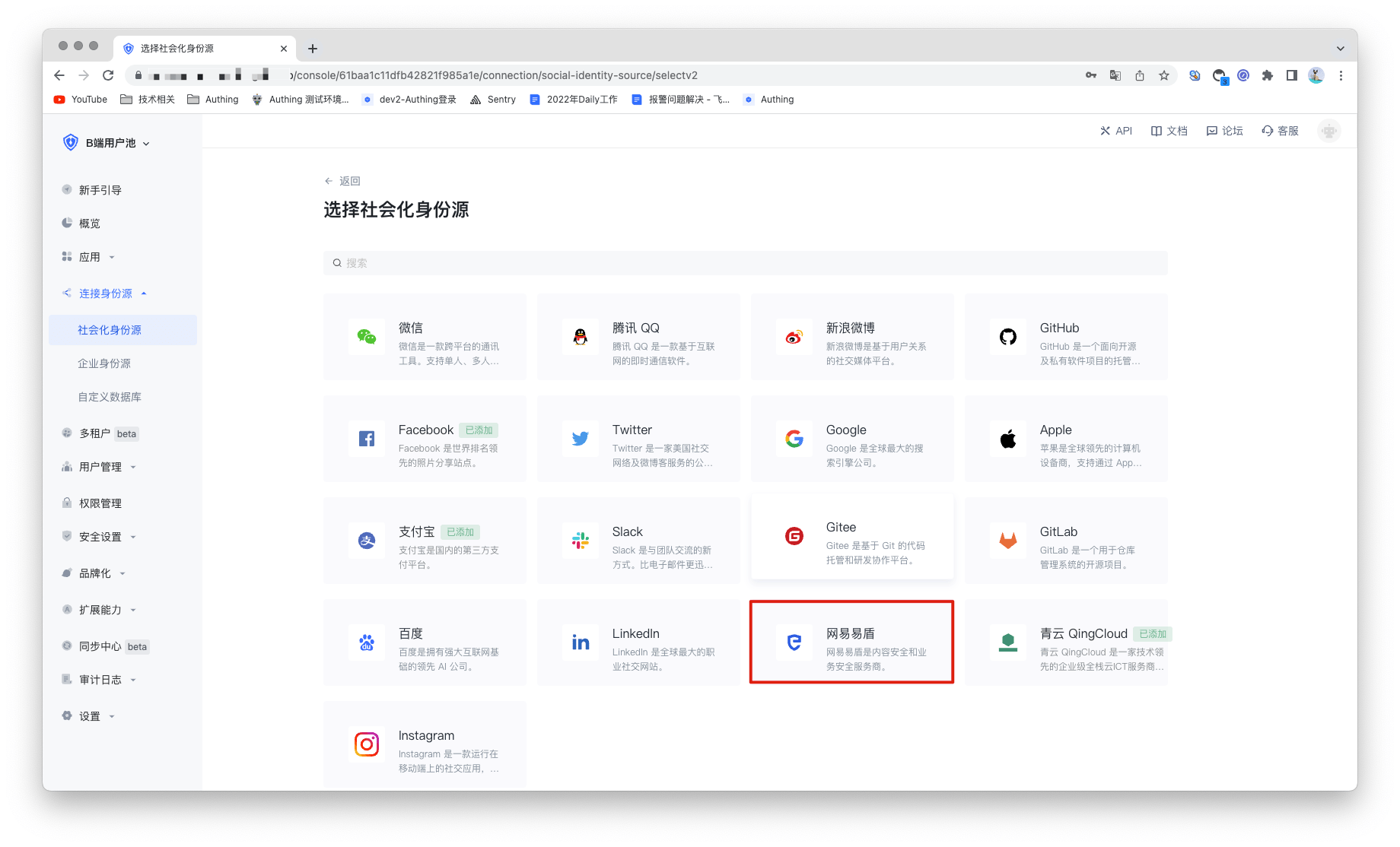 2.2 请在 Authing Console 控制台 的「社会化身份源」-「选择社会化身份源」页面,点击「易盾」身份源按钮,进入 「易盾登录模式」页面。