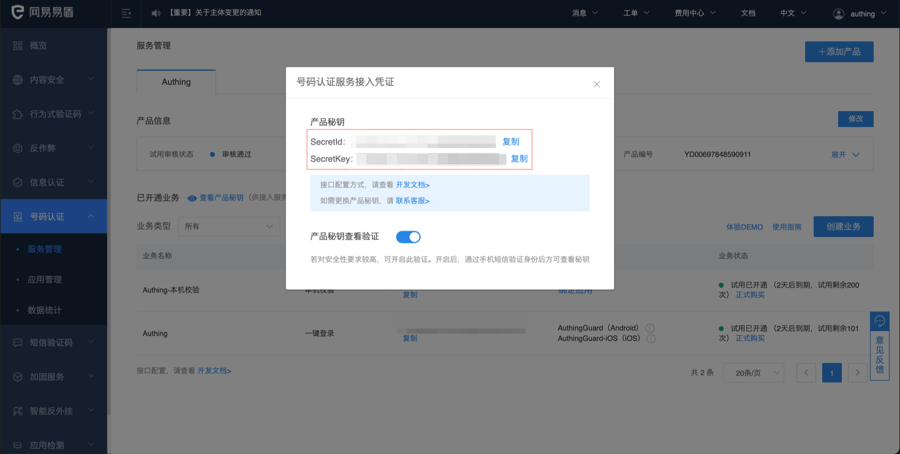 创建完应用,设置包名,上传签名等操作完成后,需要记录下业务 ID (business Id) 和号码认证服务接入凭证的产品密钥 SecretId、SecretKey。后续在 Authing 控制台配置易盾身份源时需要该数据。