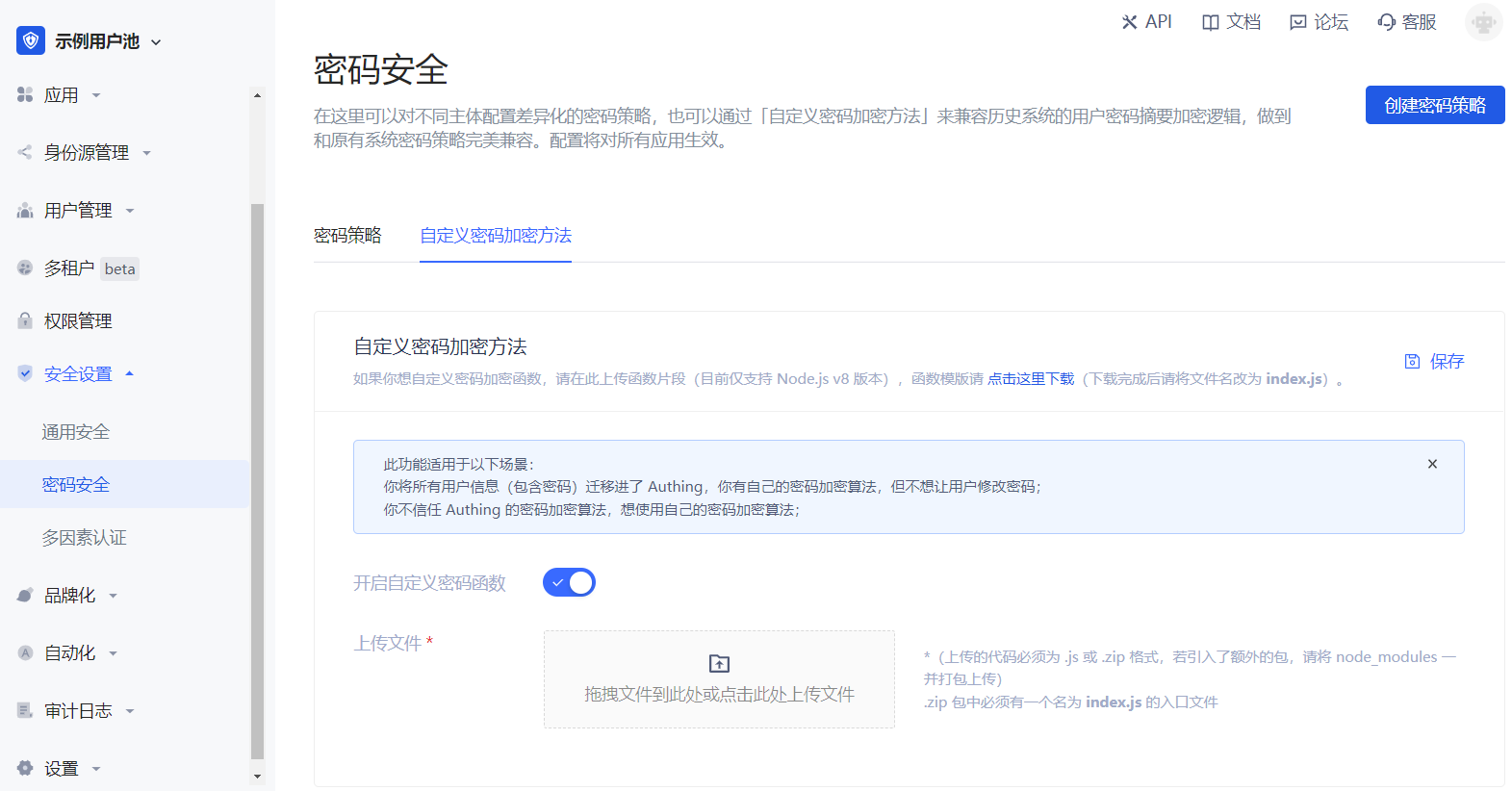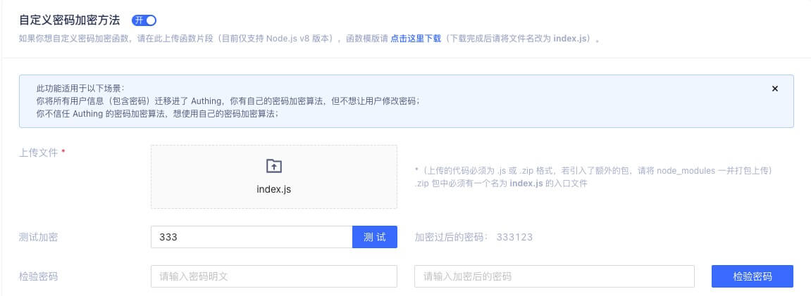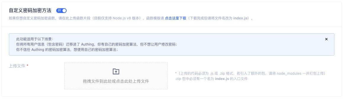 如果你想自定义密码加密函数,请在此上传函数片段(目前仅支持 Node.js),函数模版请点击这里下载 (opens new window)(Authing 不会存储用户的密码原文)。