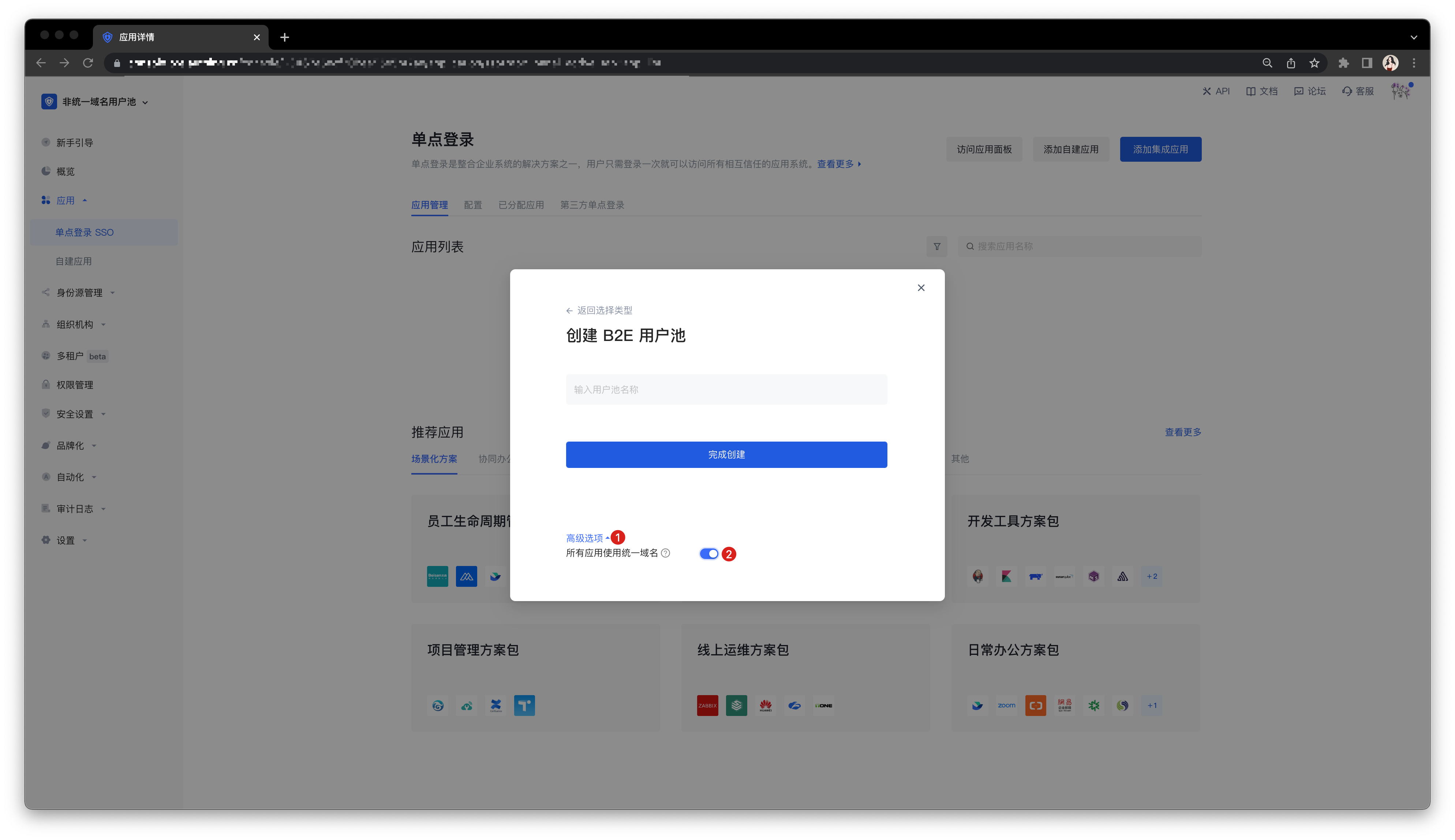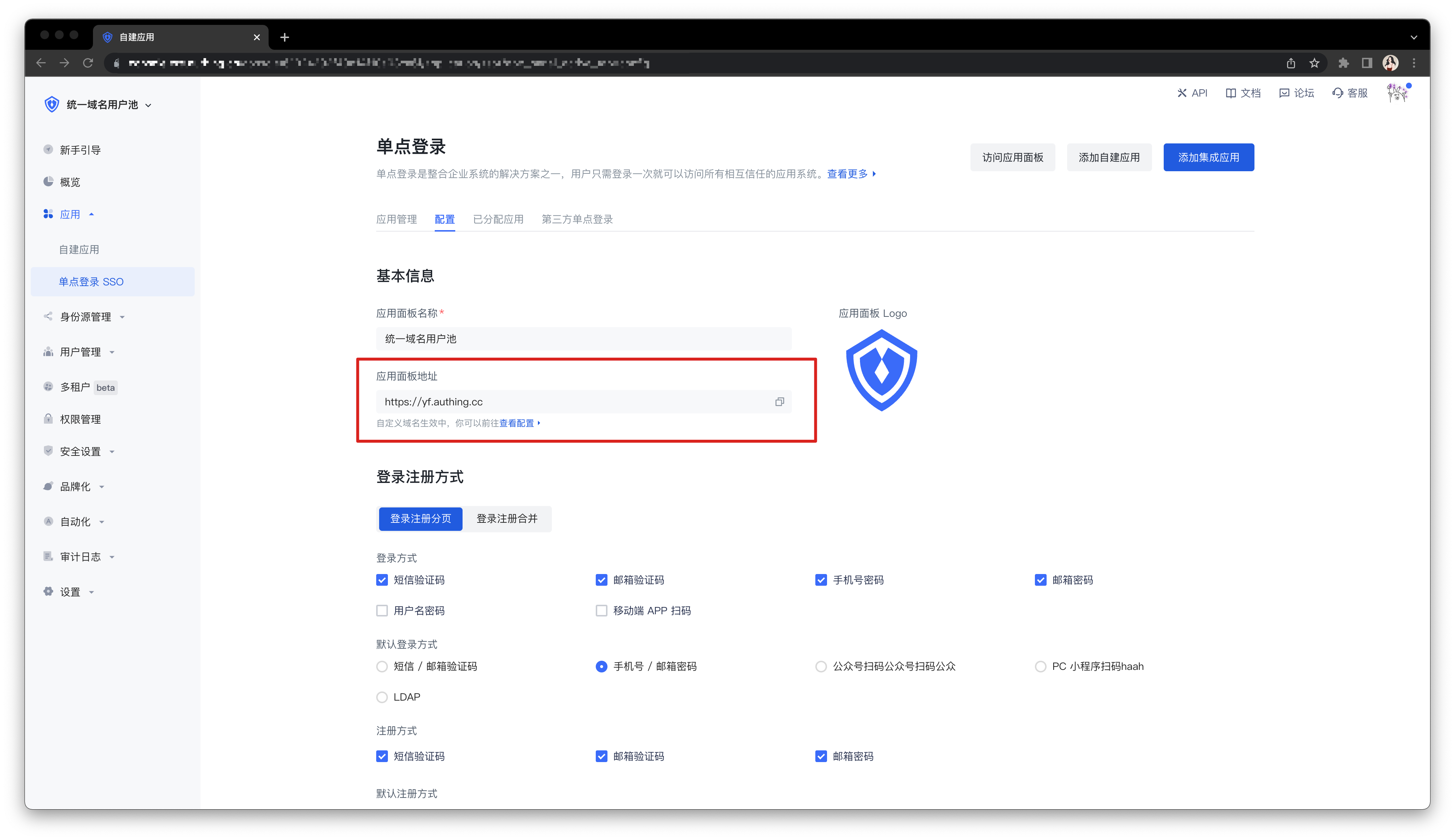 • 实现效果:应用面板、用户池中的所有自建应用和集成应用均使用统一的自定义域名。