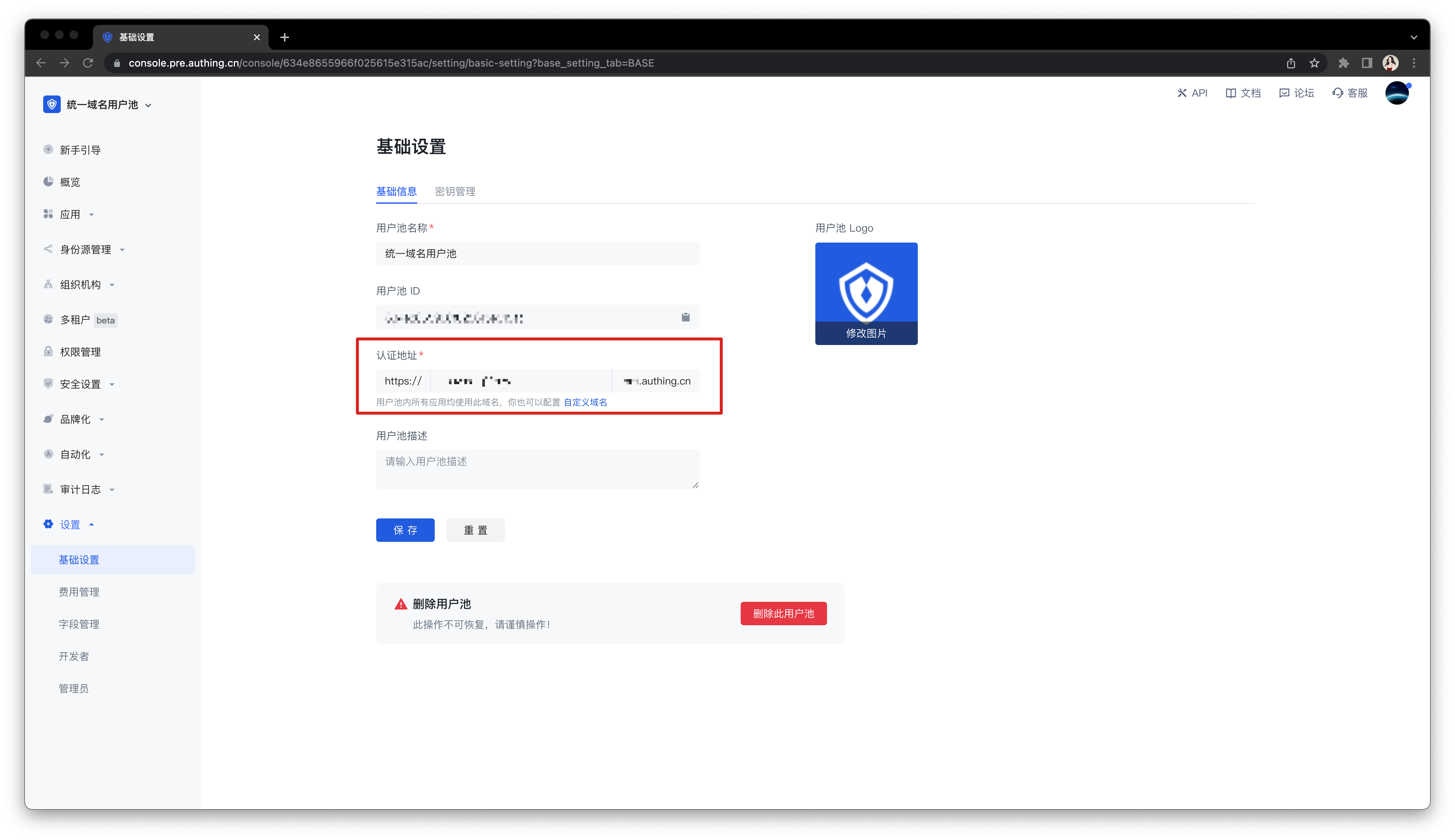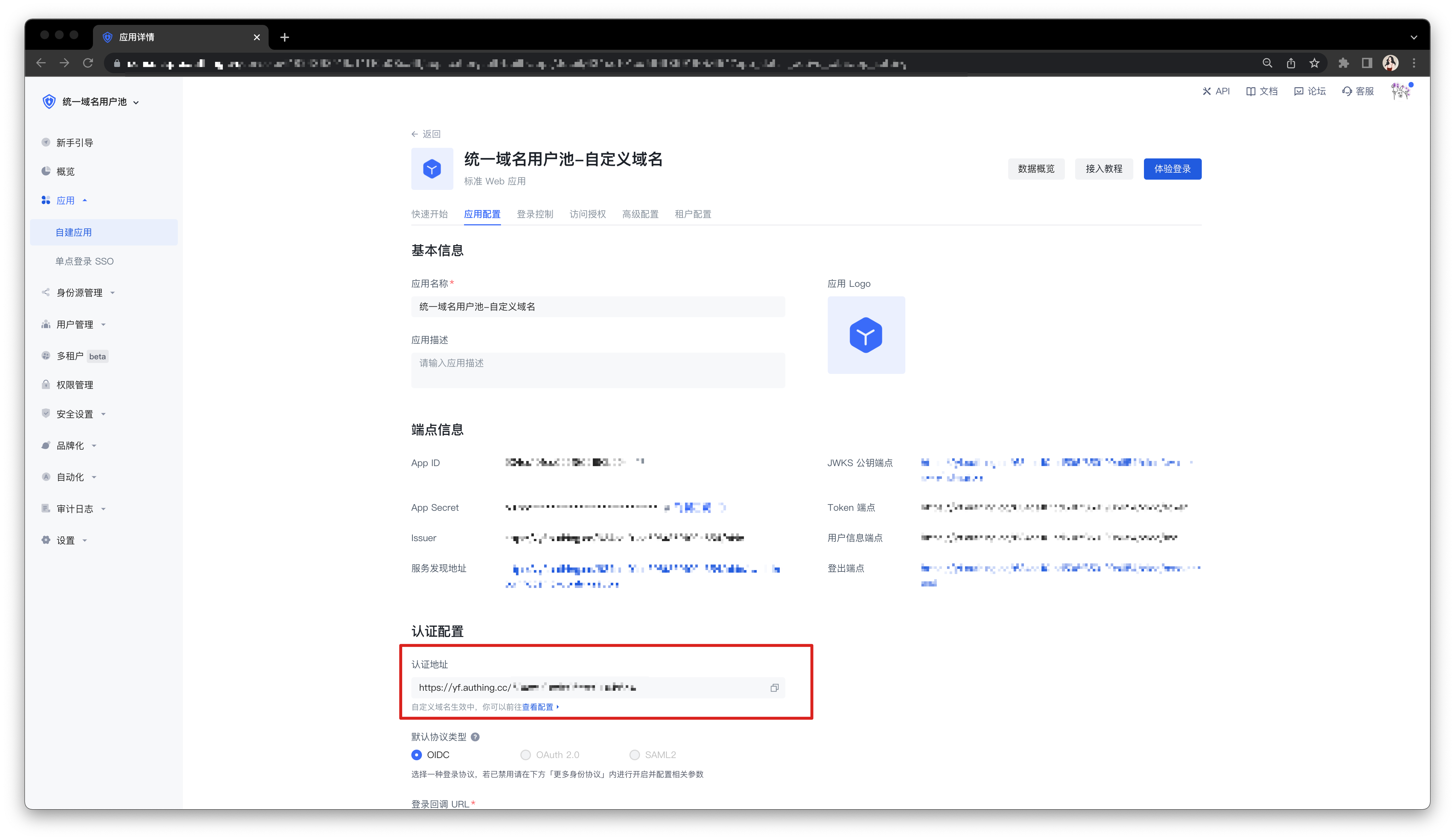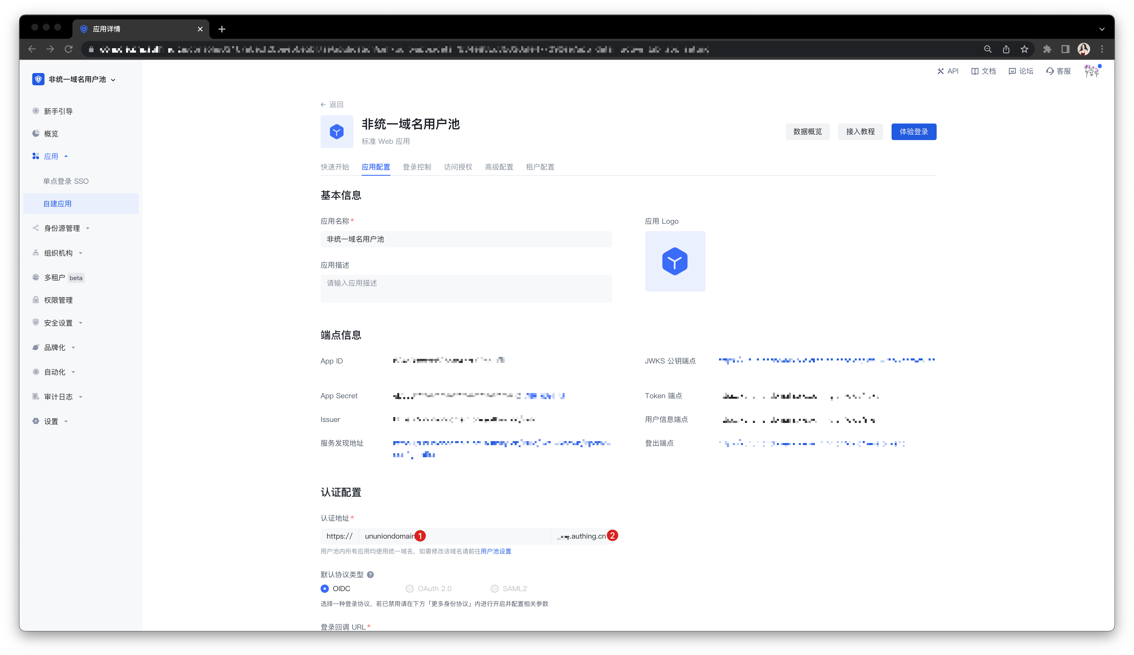 与此对比,统一域名指的是同一个用户池中各种类型的应用均使用同样的三级域名。创建此类用户池之后,你可以在用户池 设置->基础设置->基础信息 标签页对此用户池统一的三级域名进行修改。你的修改将会对该用户池中的所有应用同时生效,不同应用之间将会通过在认证地址后拼接 App ID 的方式进行区分(xxx.authing.cn/APP_ID)。