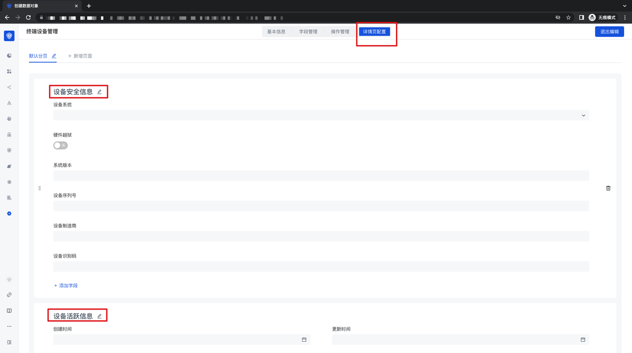 - 详情页配置:展示了某个设备详情页面的配置,可以对详情页的 Tab 及相应的字段进行配置;