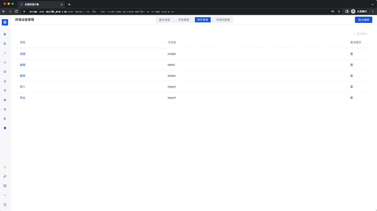 - 操作管理:展示的是针对设备管理的常规表单操作能力,包含 「创建」、「编辑」、「删除」、「导入」、「导出」的能力;