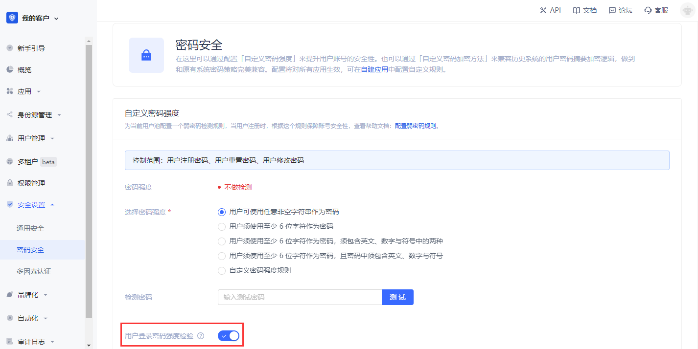 - 选择适用的密码强度(不作检测、低强度、中强度、高强度、自定义强度)。