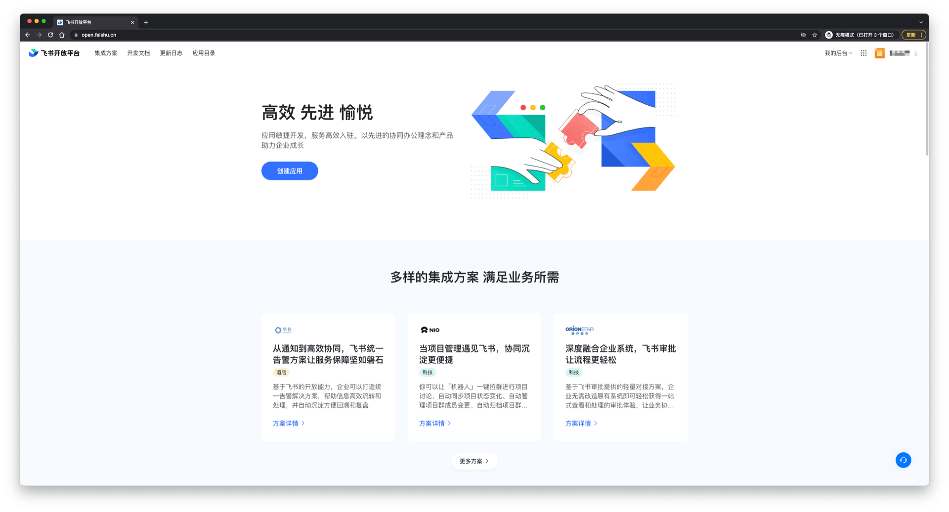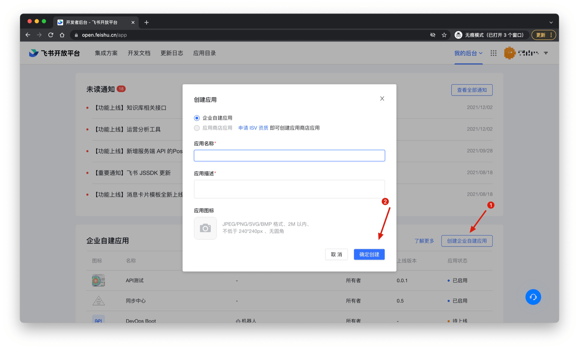 - 进入飞书开放平台 (opens new window),打开开发者后台。