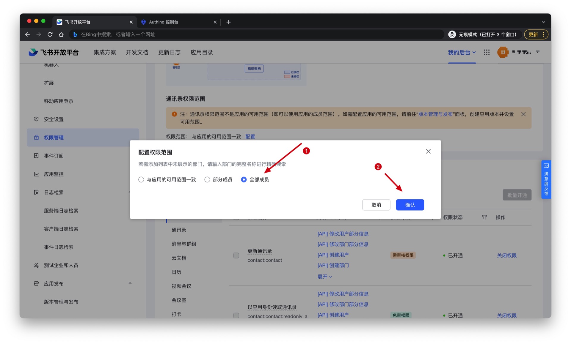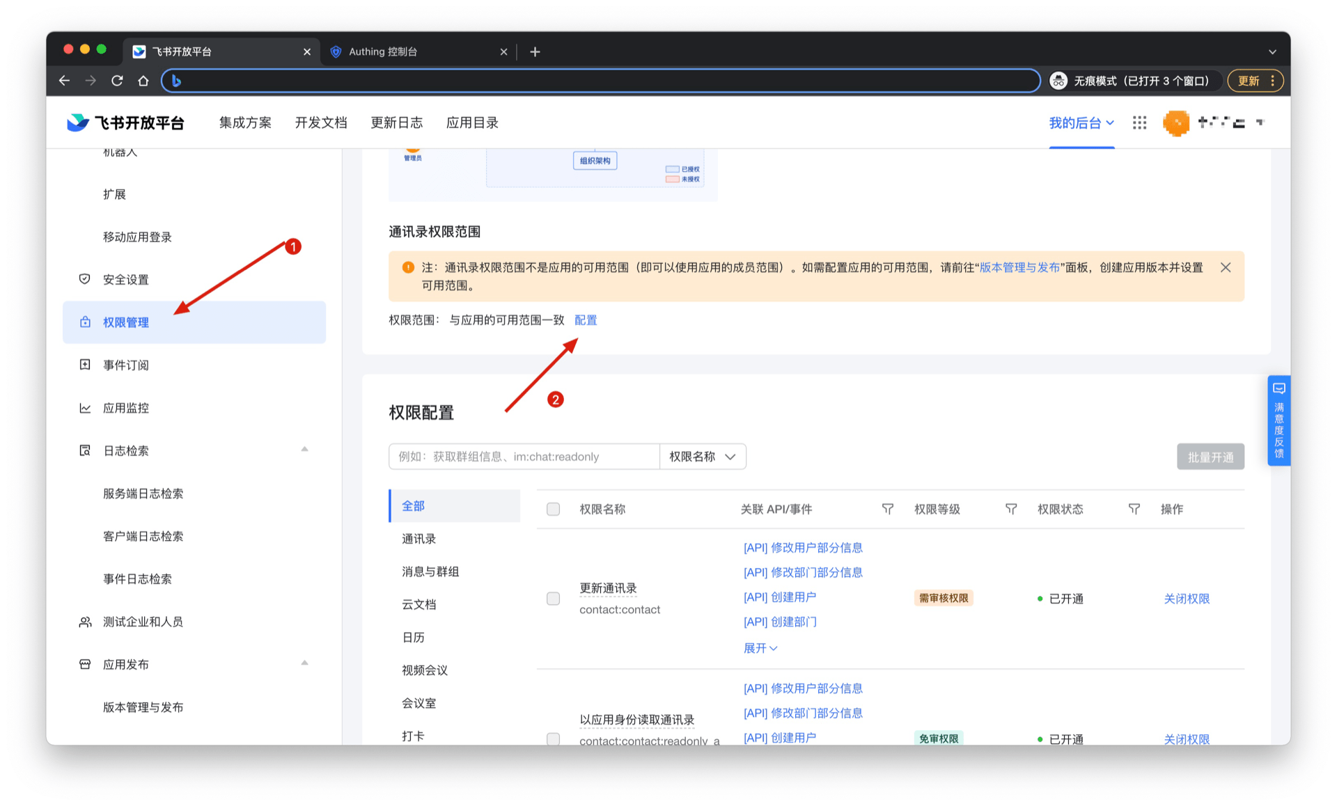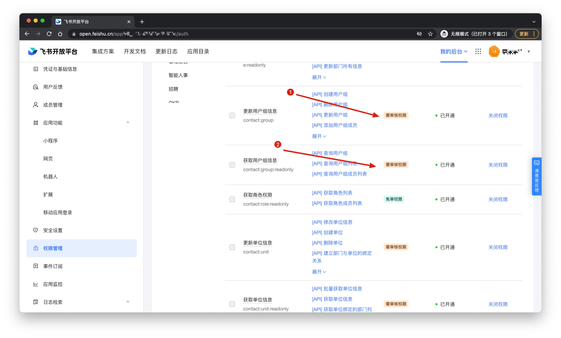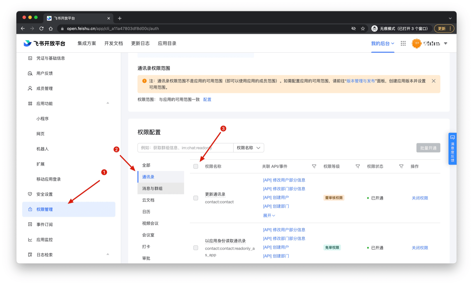 - 在飞书应用详情的权限管理页面,选择该应用所需的权限,如: