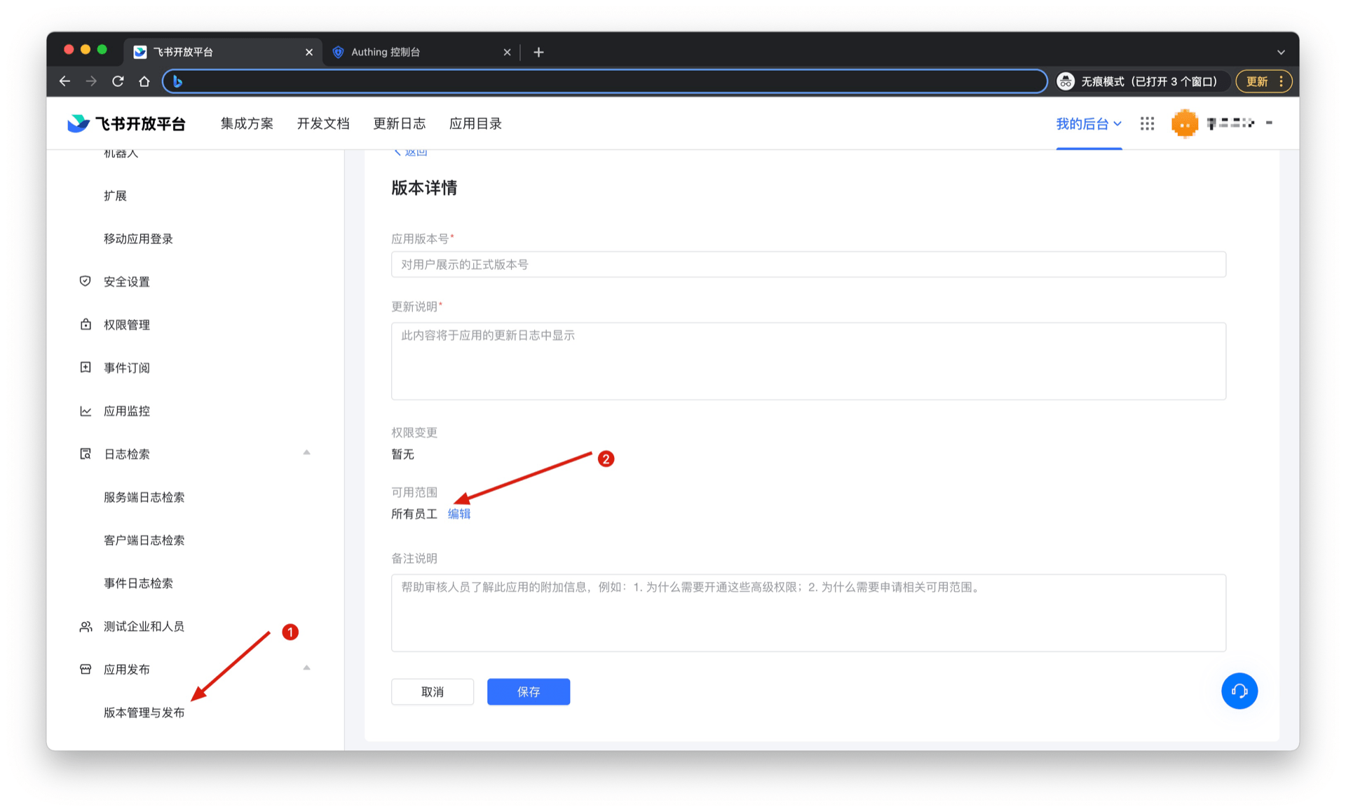 创建新版本时,注意可用范围选择所有员工和通讯录权限保持一致。