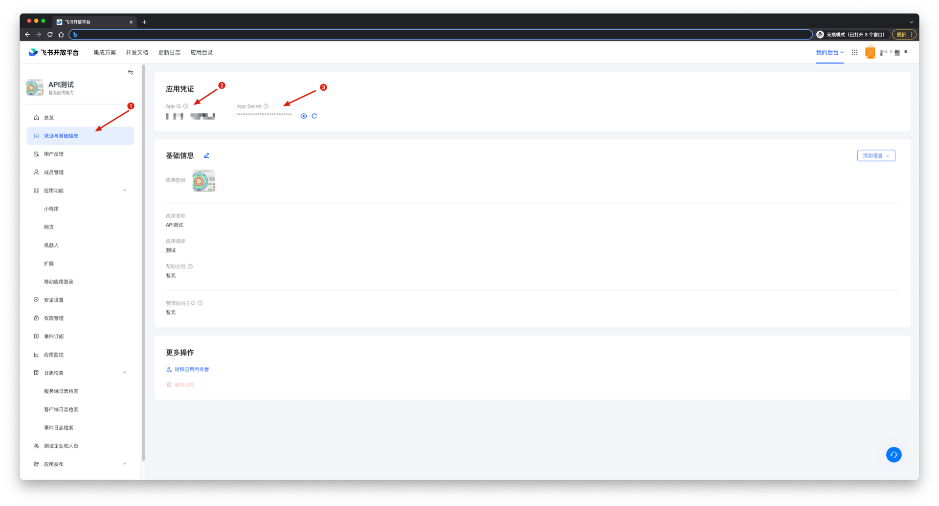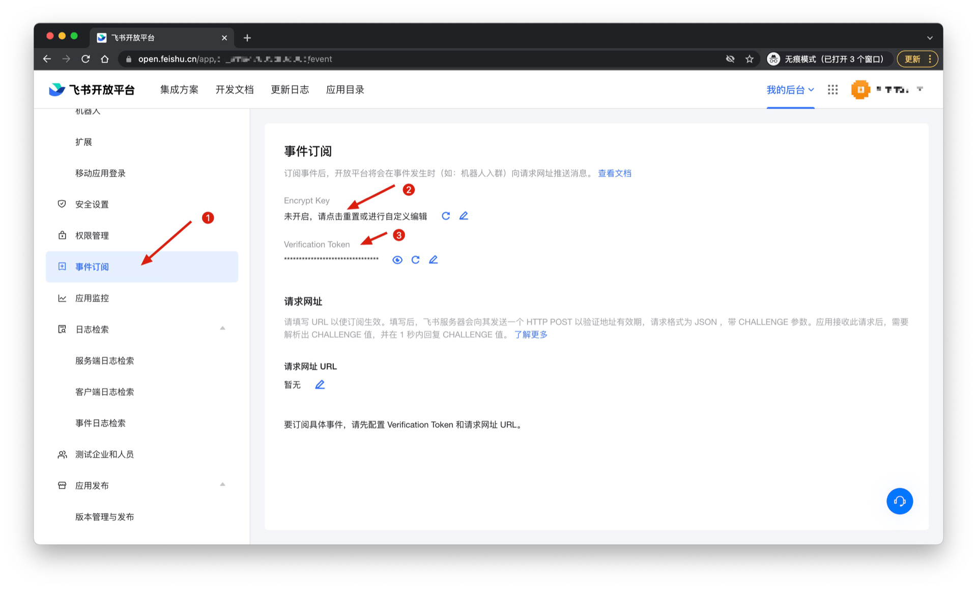 - 获取 App ID、App Secret、Encrypt Key(实时同步必填) 和 Verification Token(实时同步必填)。