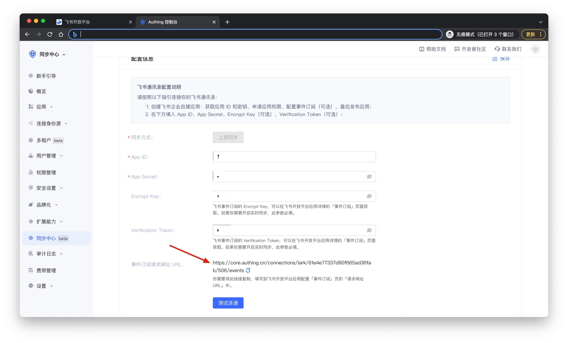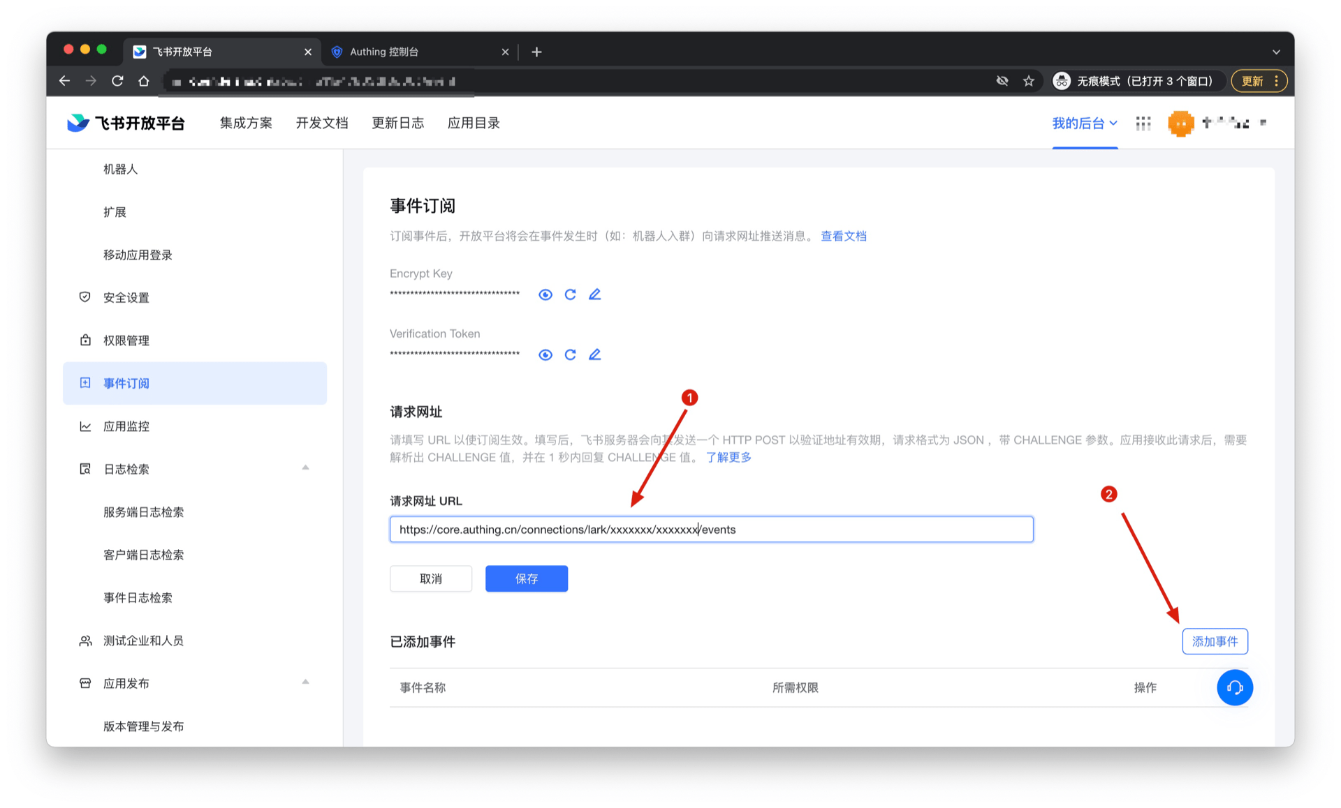 - 如果不需要实时同步,将 App ID 和 App Secret 填入 Authing 并点击保存,然后进入步骤5。 如果需要进行实时同步,则必须提供 Encrypt Key 和 Verification Token。 将所有参数填入 Authing 之后,点击保存。然后重新进入配置详情页,Authing 会自动生成一个回调地址,该地址用于接收飞书事件。因此需要将该地址填入飞书「事件订阅」页面的「请求网址」中,并添加需要监听的事件。 你需要勾选以下事件: