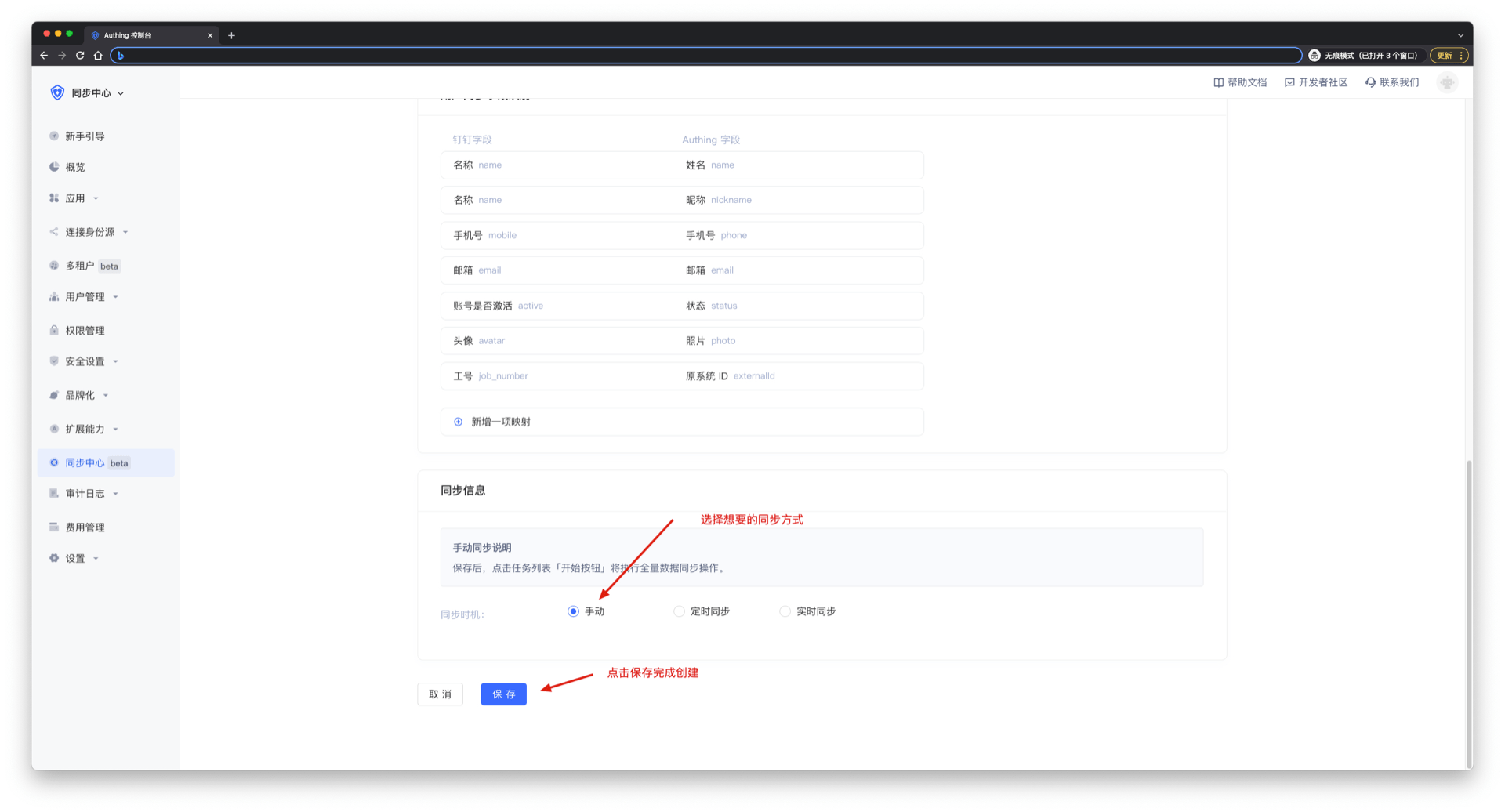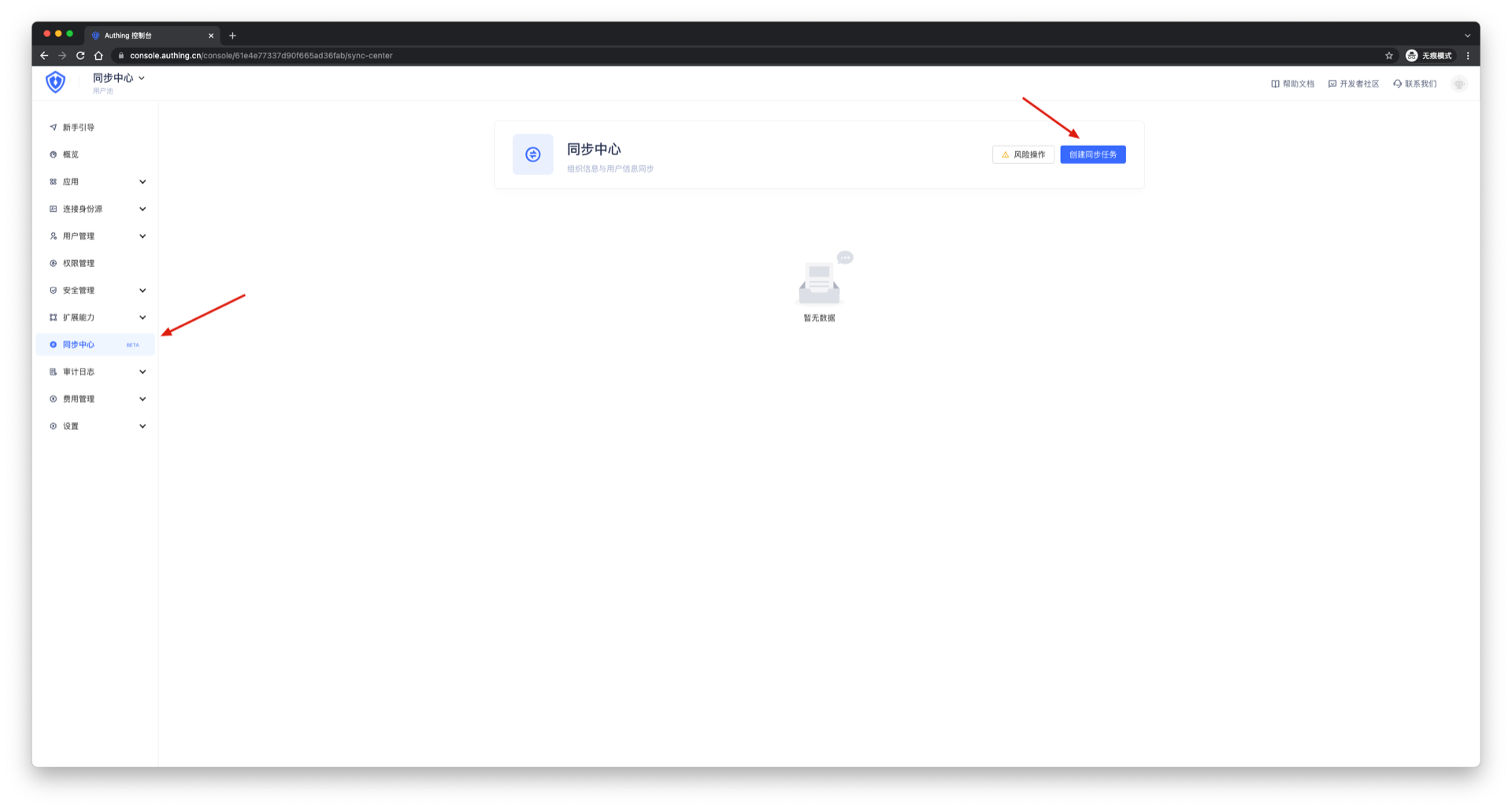 在 Authing 控制台-同步中心创建同步任务,创建一个同步任务。同一个用户池仅支持同一个身份源创建一个上游同步任务或者一个下游同步任务。比如在一个用户池中存在钉钉上游同步任务,就无法再创建钉钉下游同步任务,但是可以创建飞书下游同步任务。因为钉钉上游和钉钉下游属于同一个身份源,而飞书和钉钉是不同身份源。