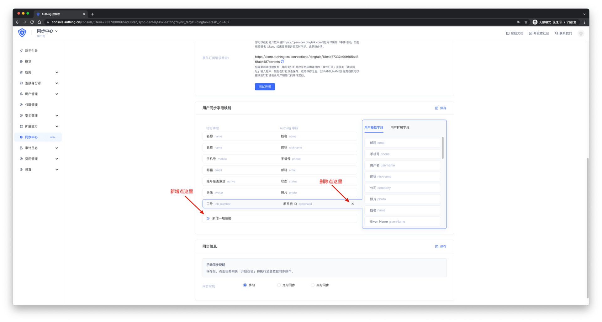 完成测试连通之后,开始配置自定义字段映射。系统会先默认配置一些字段映射,如果你想要同步更多信息,可以点击下方新增一项映射添加新的映射。如果你不想同步某些信息,可以选择删除该映射。点击这里获取字段映射配置方法。