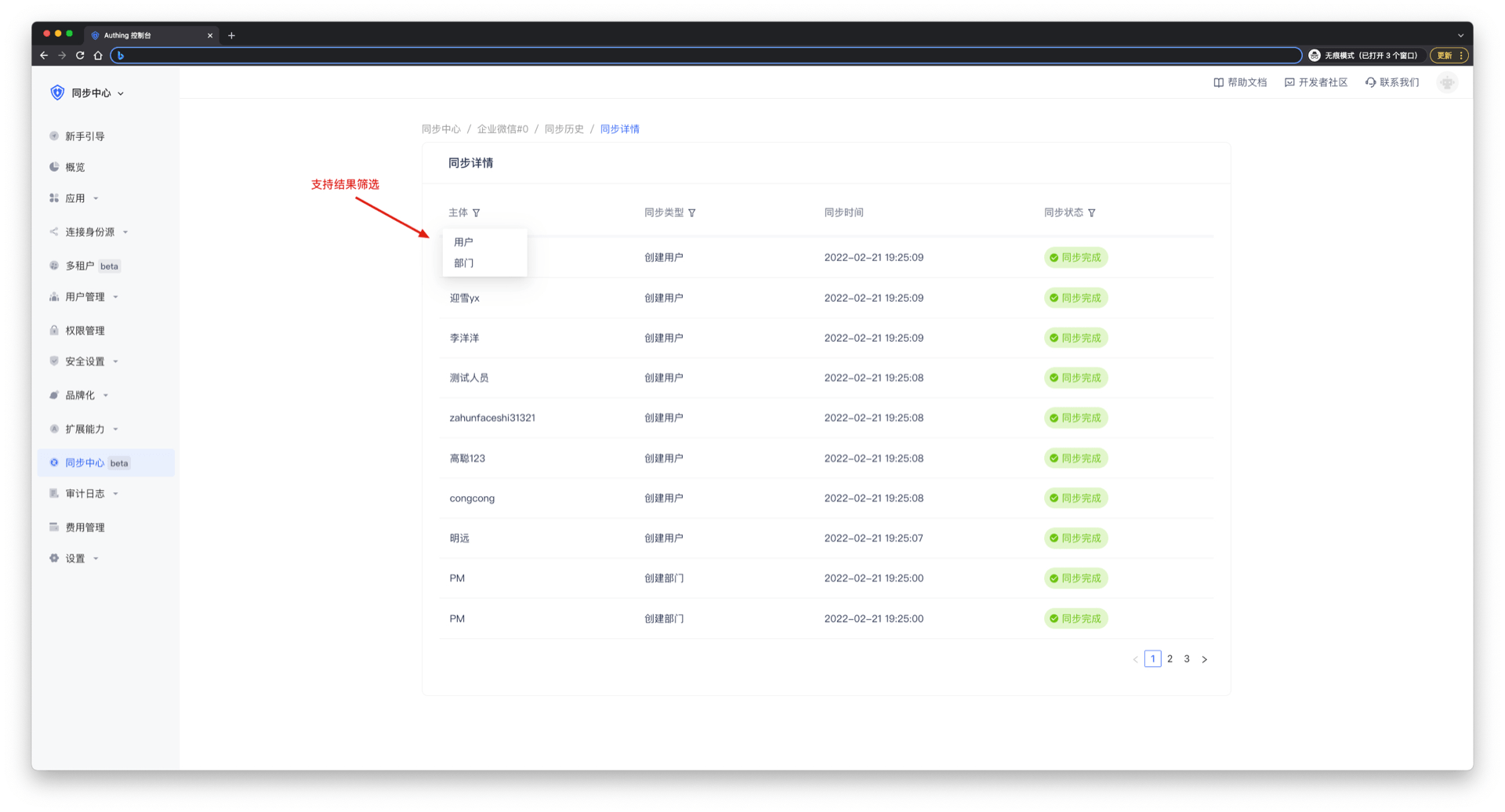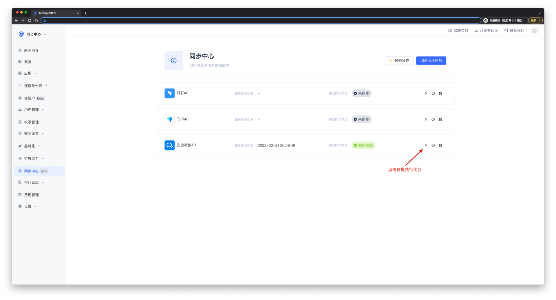 实时同步可以将上游数据变动实时同步至 Authing,实时更新,适用于增量同步场景。目前只有钉钉、企业微信、飞书支持实时同步。