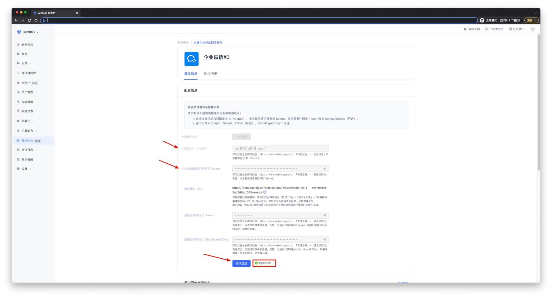 按照配置说明填写配置信息,然后点击测试连通。如果出现检验成功字样,说明连接成功。如果出现检验失败字样,则说明配置信息有误,请检查配置信息。如果要进行实时同步,点击这里获取配置信息和权限。