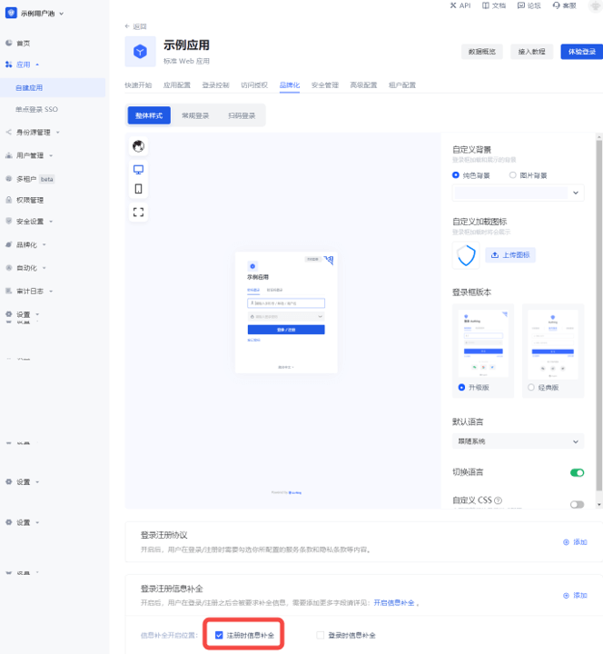 b. 然后切换到 品牌化,在 登录注册信息补全 模块勾选 注册时信息补全 开关。