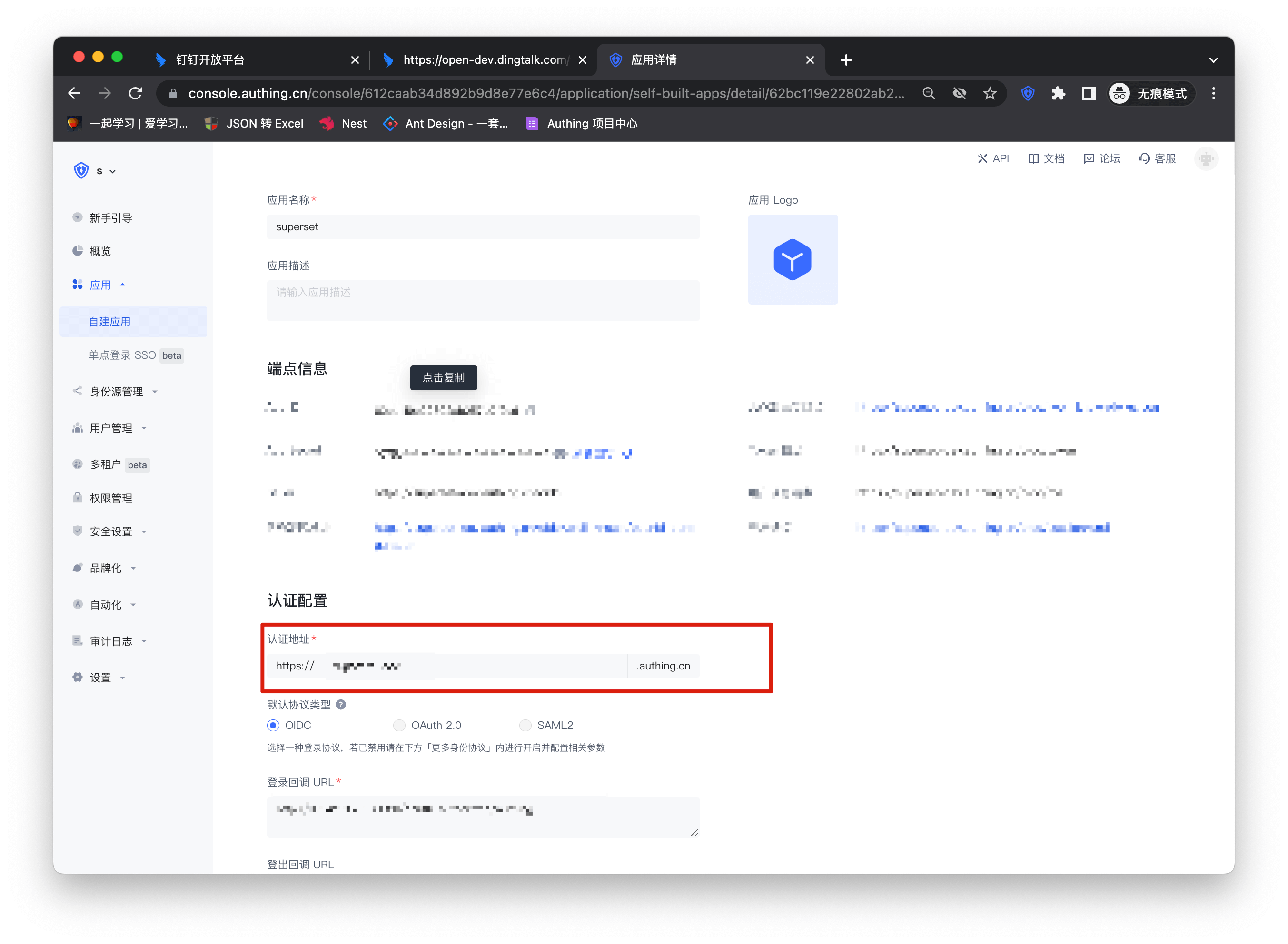 - 用户需要进入配置好的自建应用详情页,将其认证地址进行复制。