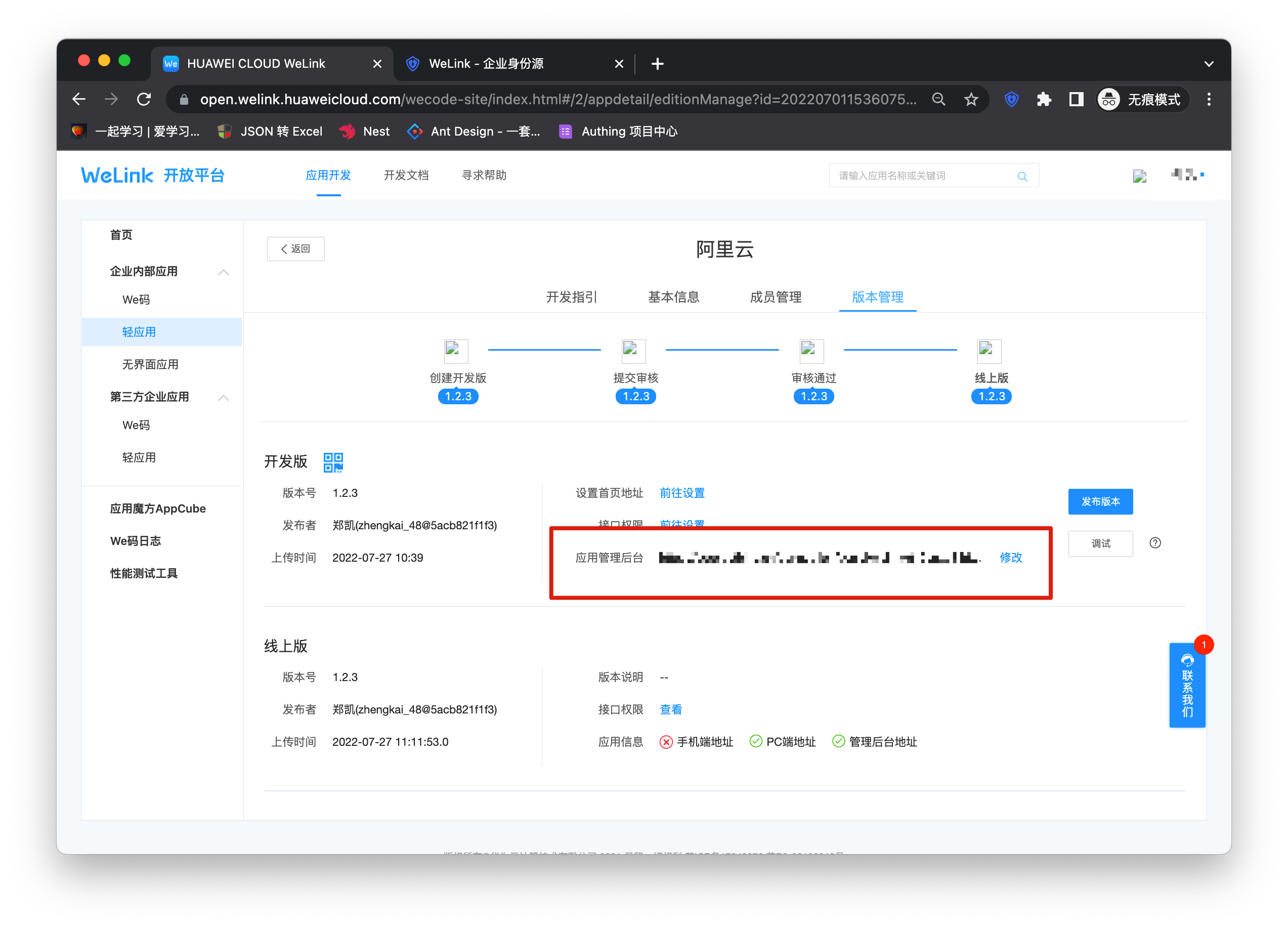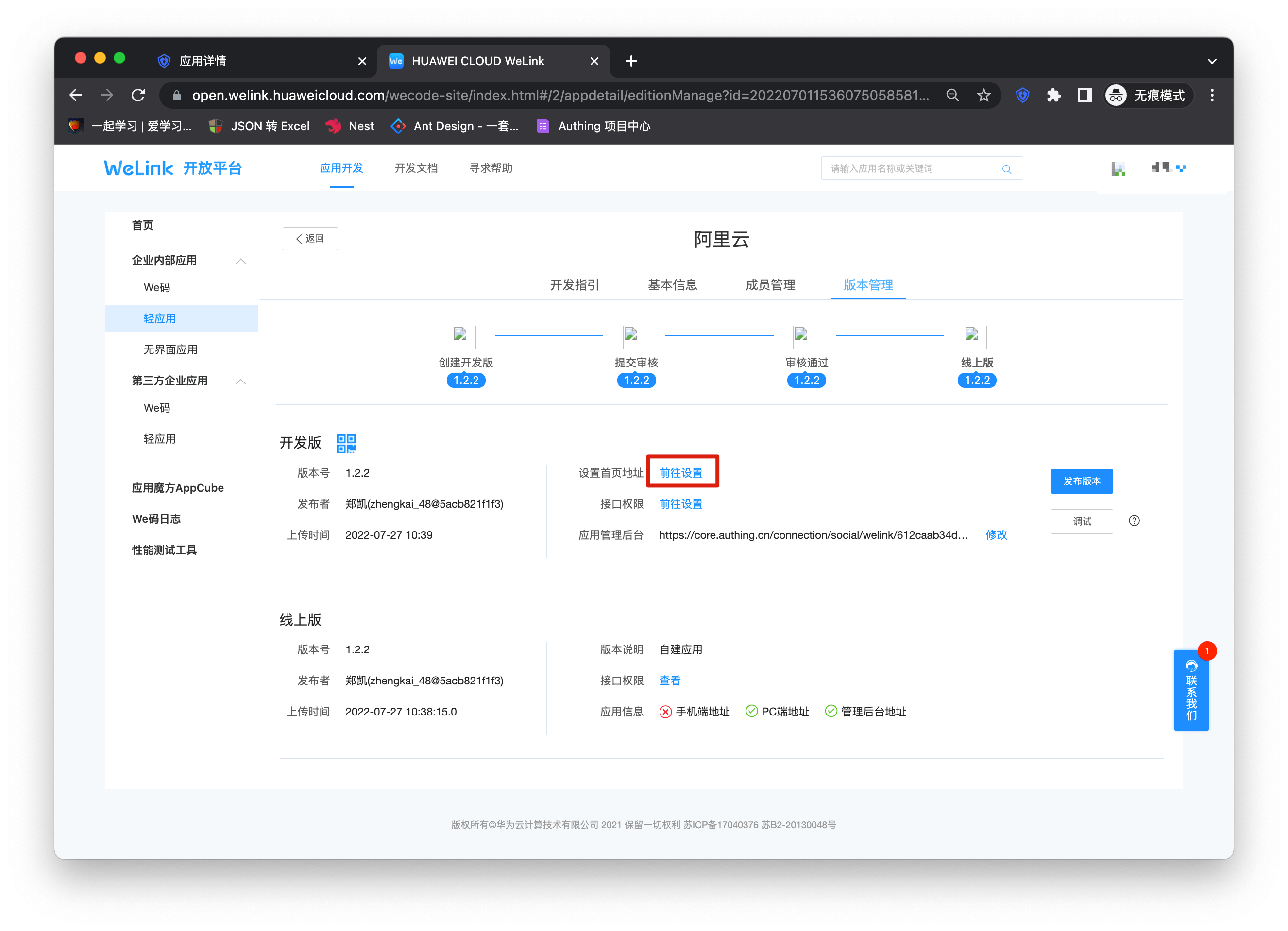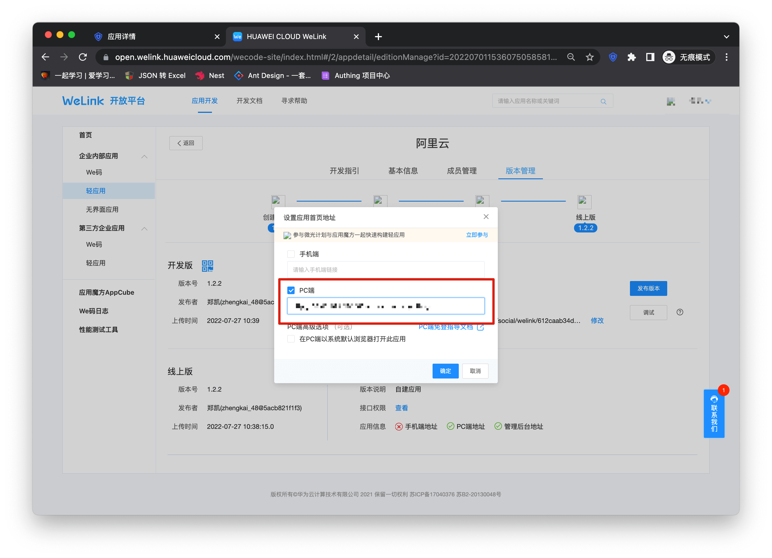 - 与集成应用类似将认证地址复制到版本管理页面的设置首页地址的 PC 端链接里。之后步骤与集成应用一致,完成权限与应用管理后台设置后再进行应用发布即可使用。