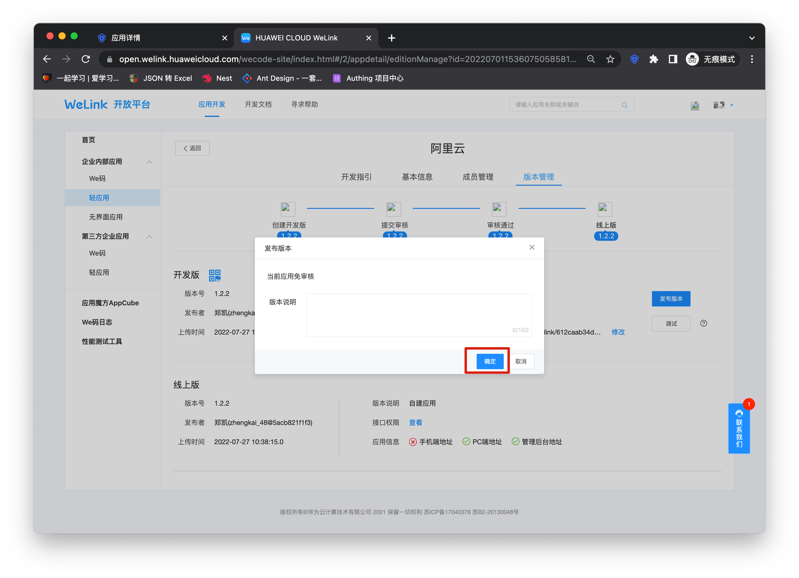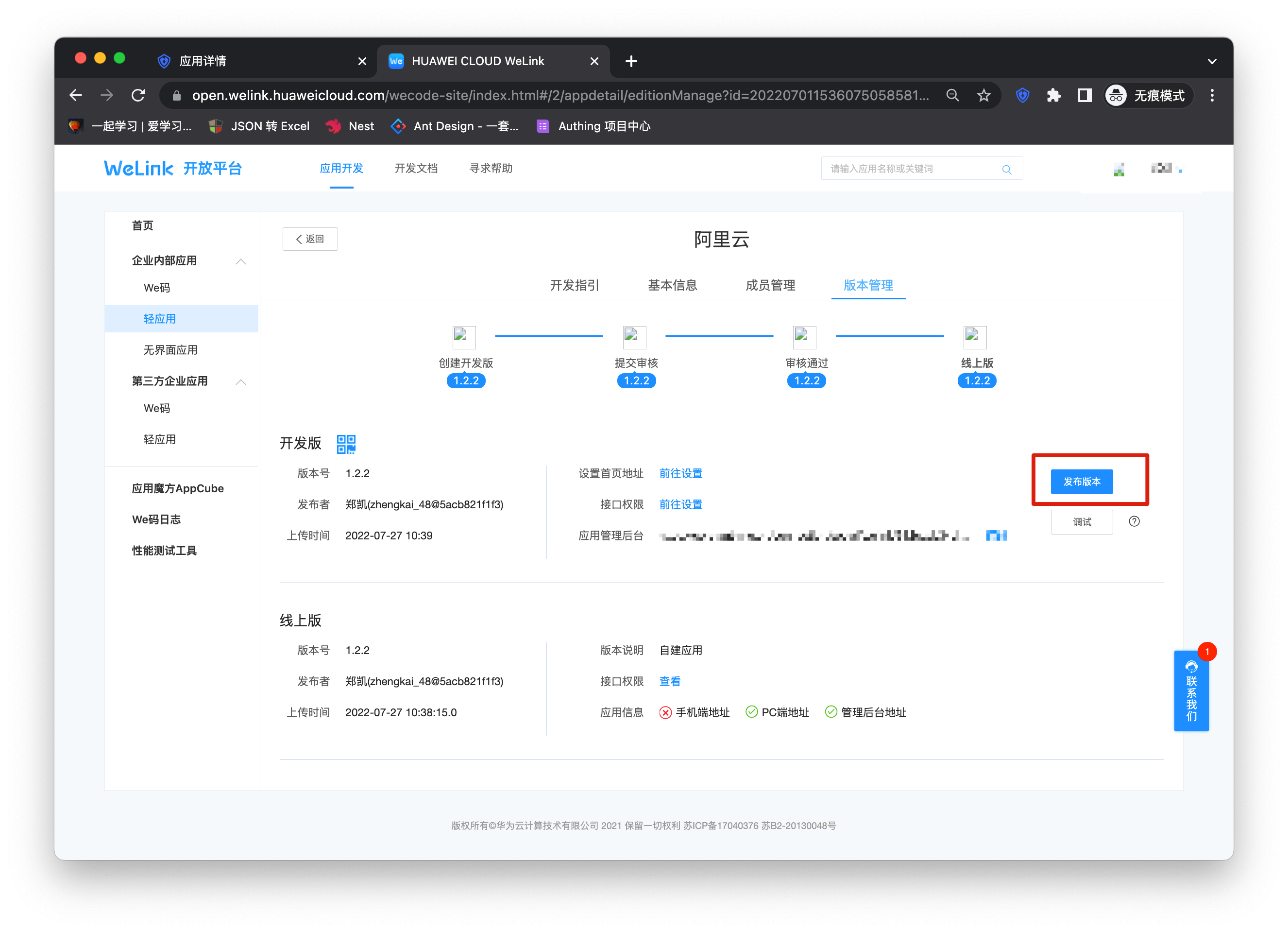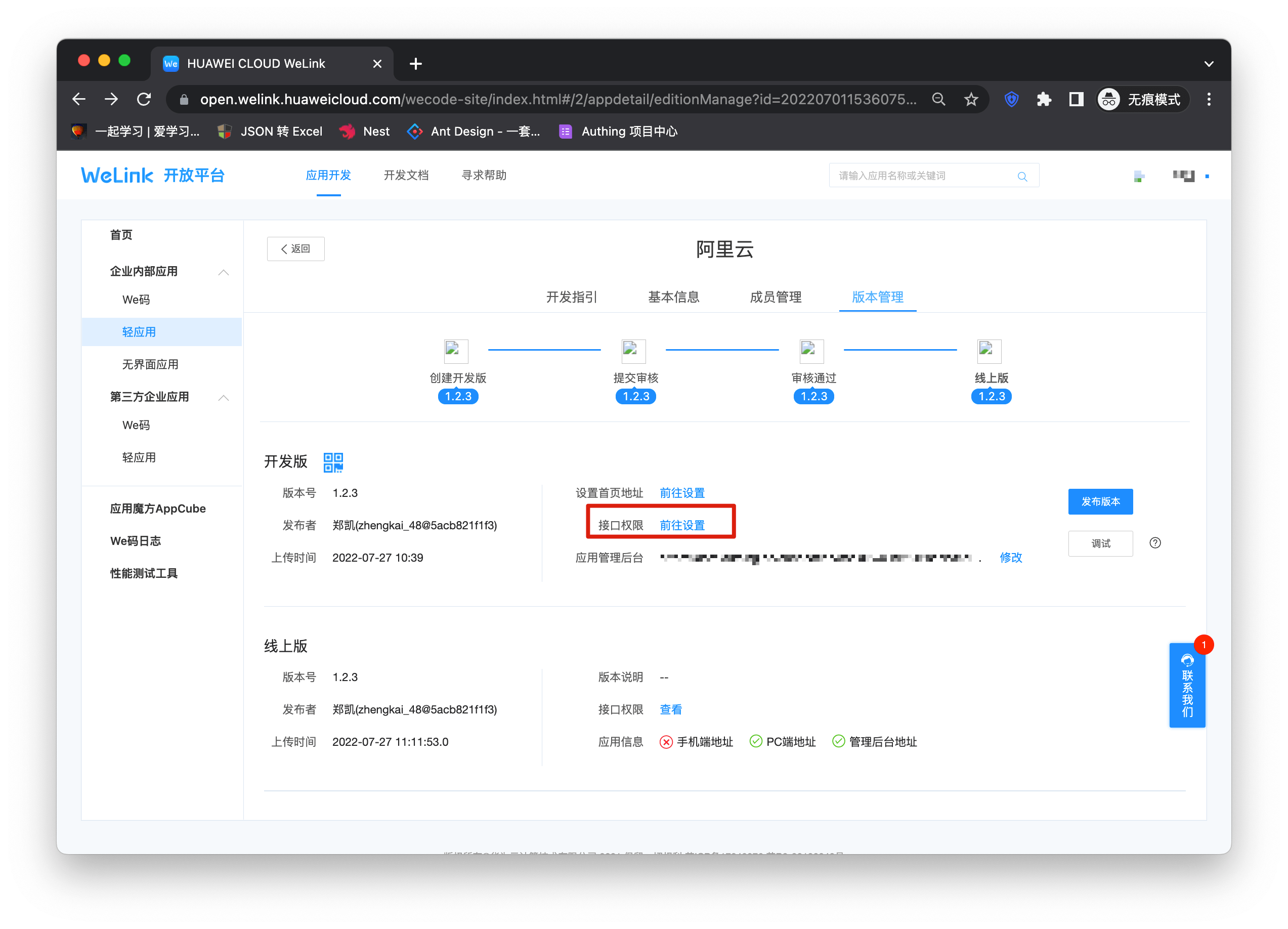 - 与集成应用类似将认证地址复制到版本管理页面的设置首页地址的 PC 端链接里。之后步骤与集成应用一致,完成权限与应用管理后台设置后再进行应用发布即可使用。