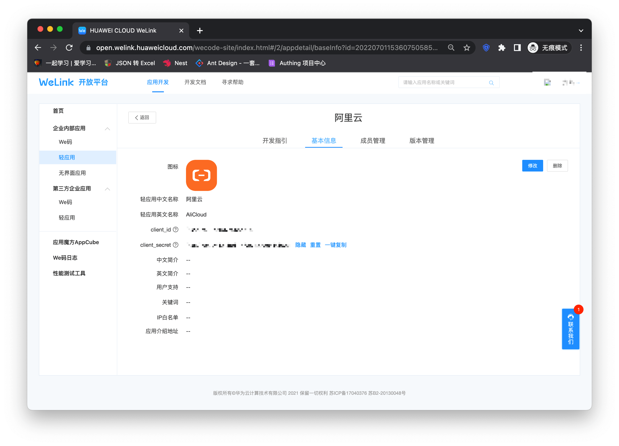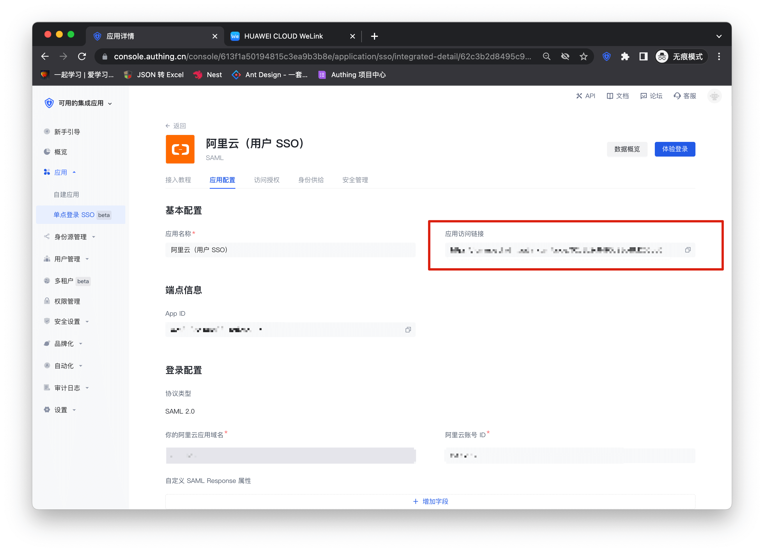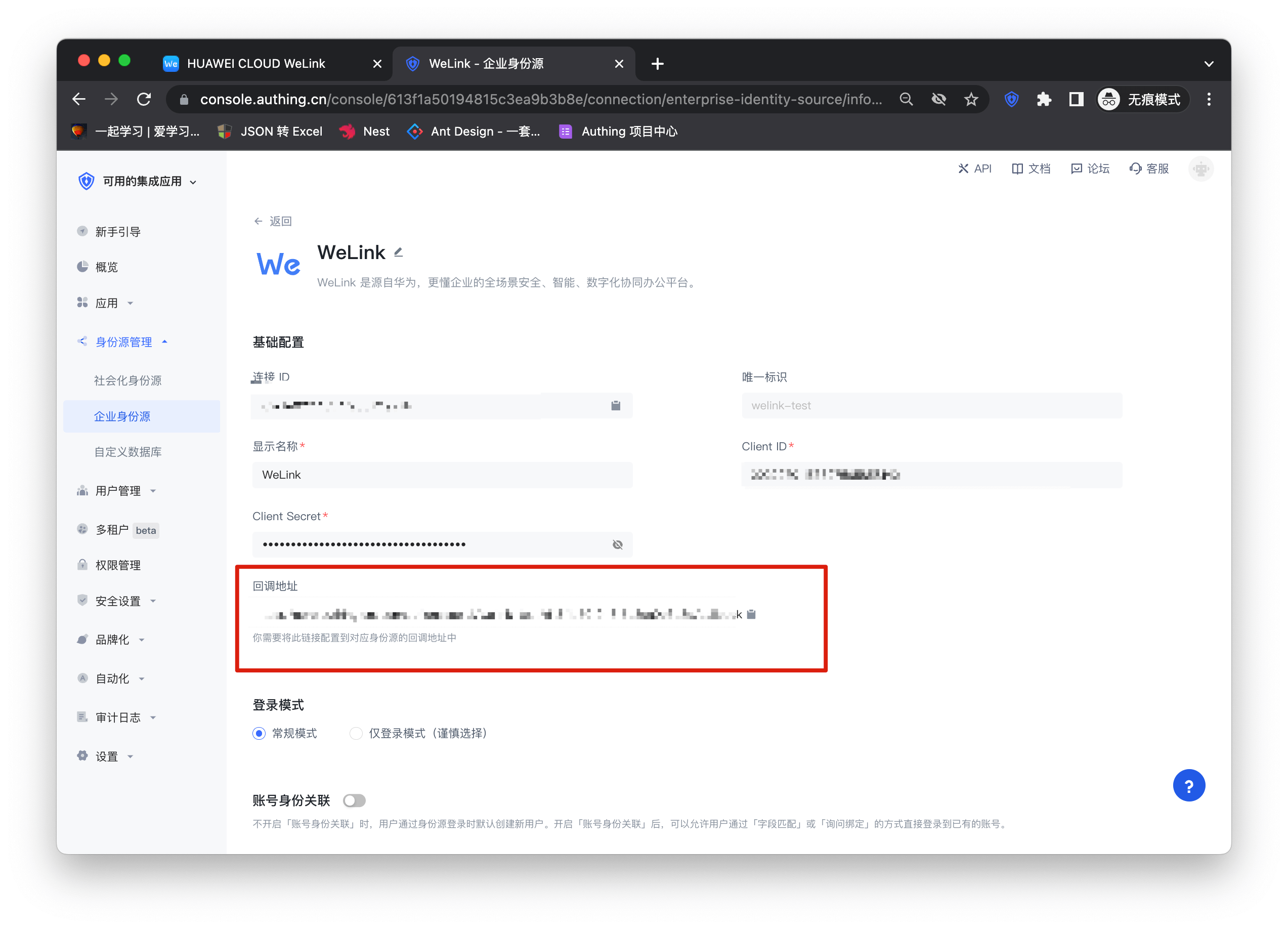 之后进入控制台将 Welink 身份源中的回调地址填入应用管理后台。