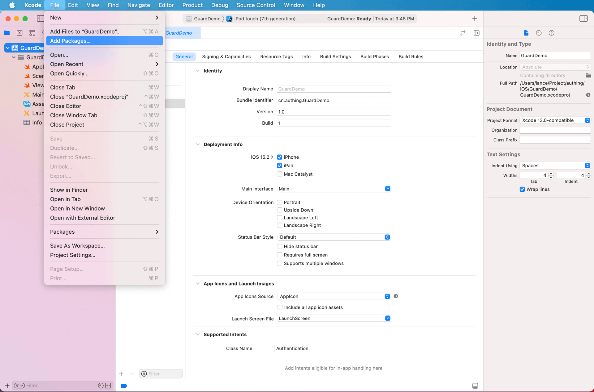 在 Xcode 菜单栏右上角选择 File 点击 Add Packages