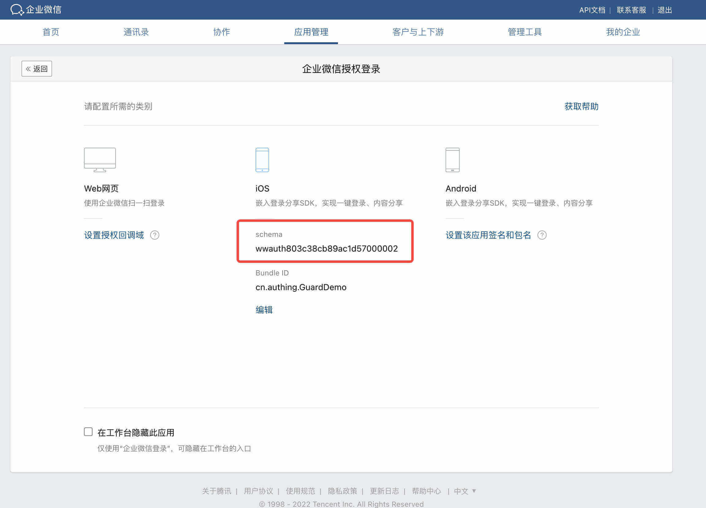 获取 CorpID AgentID Schema Secret 并填写 BundleID