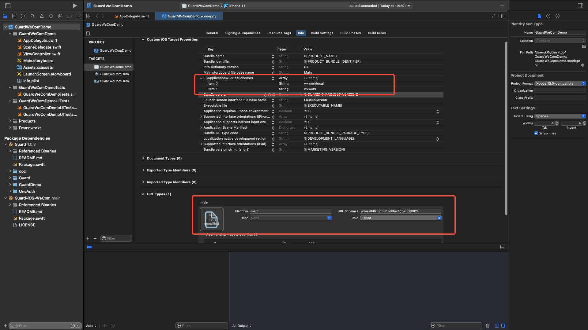 配置企业微信回跳 URL:URL types Key 下 添加企业微信管理后台申请到的 Schema (例如:wwauth803c38cb89ac1d57000002)